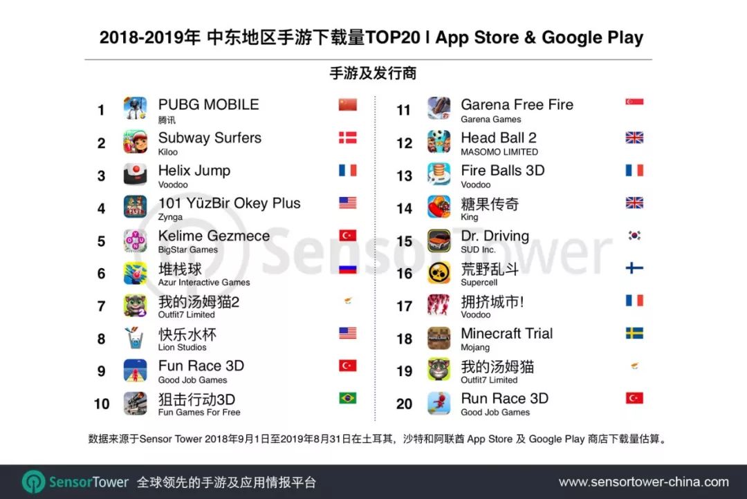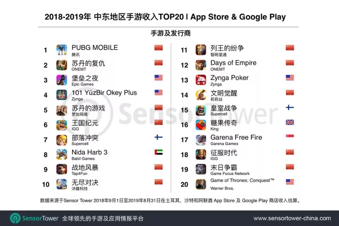 下图为土耳其,沙特和阿联酋三个市场过去一年手游收入Top20榜单。腾讯《PUBG MOBILE》吸金1亿美元居于榜首,占该游戏海外总收入的18.1%。榜单中,中国手游多达11款,占Top20总收入的69%。