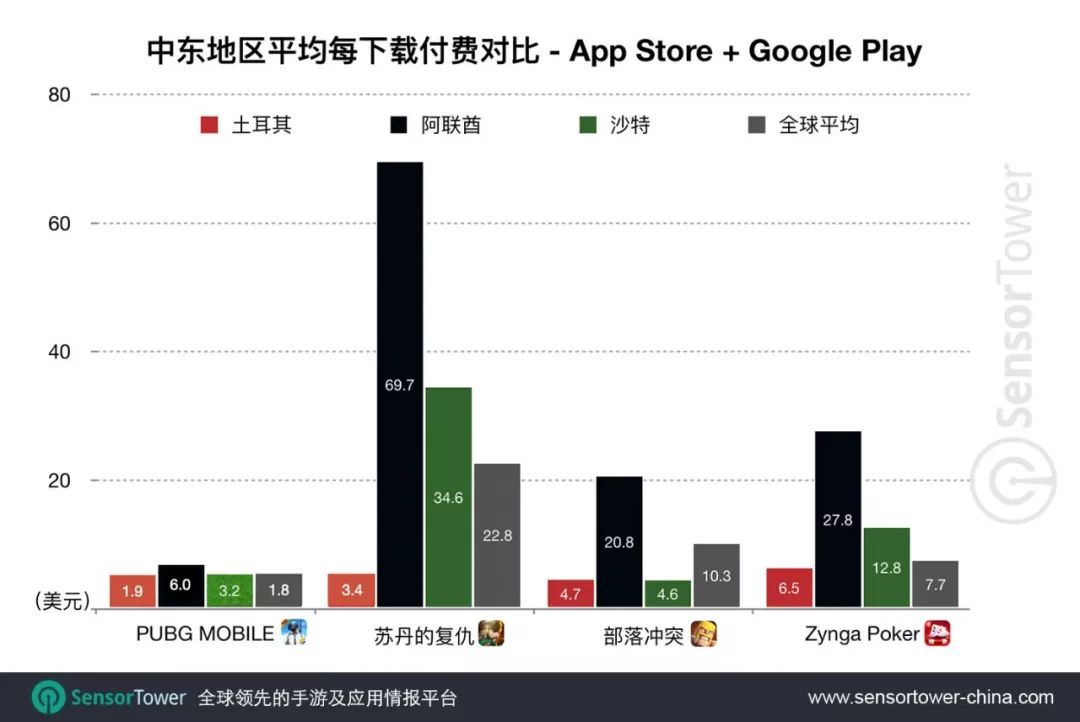 若与全球其它地区对比,阿联酋的RPD在各参照游戏中都远高于全球平均值。除了《部落冲突》,在其它参照游戏中,阿联酋的RPD是全球平均值的3倍以上,沙特的RPD亦高于全球平均值。土耳其的RPD则基本低于全球平均值,仅在《PUBG MOBILE》略微反超。