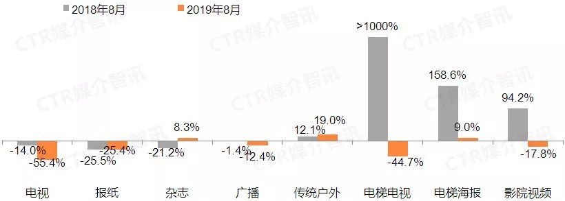 根据CTR媒介智讯广告监测数据显示,2019年8月乘用车全媒体广告投放同比降幅呈现今年新低,降幅达32.9%;环比维持正增长,为10.1%。
