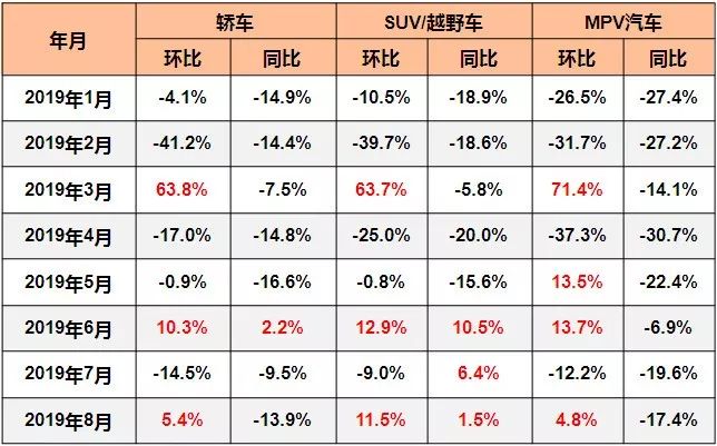 根据中国汽车工业协会的数据显示,2019年8月,三大类乘用车品类销量环比均呈现正增长,以SUV/越野车的增幅最明显;销量同比,轿车和MPV汽车均持续下滑。虽然SUV/越野车继续正增长,但增幅有所收窄。