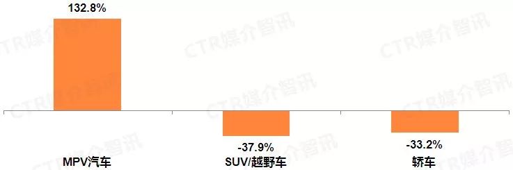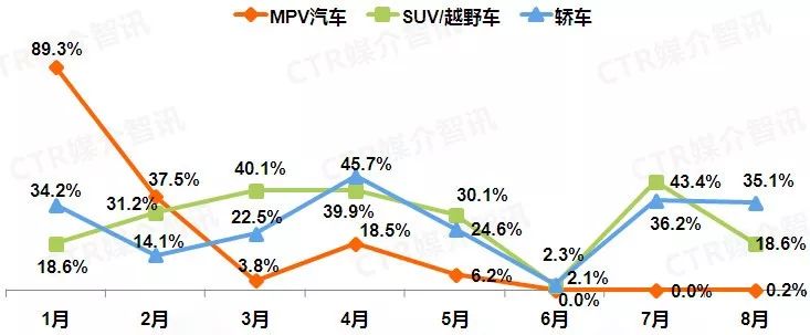 根据CTR媒介智讯广告监测数据显示,8月三大乘用车品类中MPV汽车广告投放同比增长迅猛,高达132.8%,主要来自于福建梅赛德斯-奔驰V级MPV的广告增投助力,而SUV/越野车和轿车的广告刊例花费降幅较上月均有明显扩大。