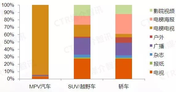 从2019年8月乘用车在各媒体投放表现来看,MPV汽车将94.9%的广告投放占比放在电梯电视上,电视和广播二个媒体合计仅占比4.9%。