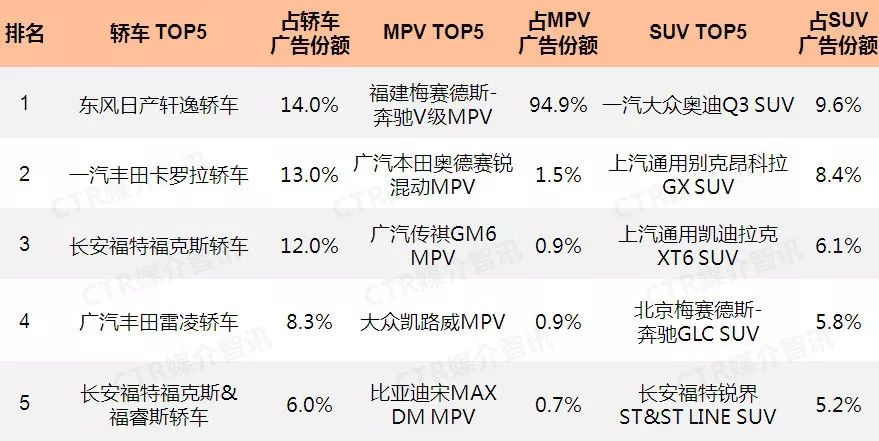 2019年8月乘用车广告投放份额TOP5产品