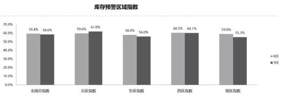 从区域指数情况看:9月份全国总指数为58.6%,北区指数为61.8%,东区指数为56.0%,南区指数为55.3%,西区指数为60.1%。