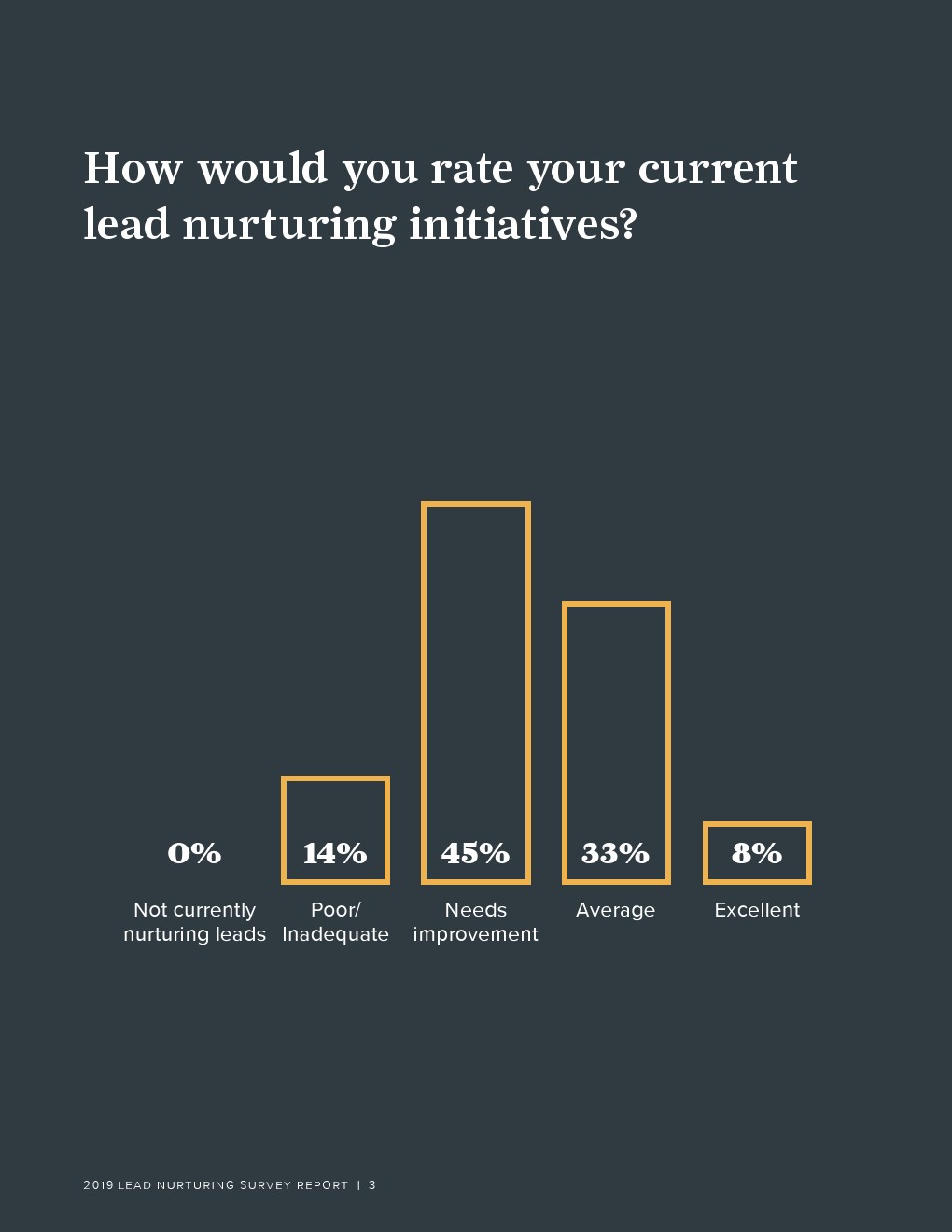 根据Demand Gen Report和PathFactory最近的一份报告,大多数营销人员表示,他们的潜在客户培养计划要么需要改进(45%),要么很差或不足(14%)。只有少数B2B营销人员(8%)认为他们在当前的潜在客户养成方面做得很好。