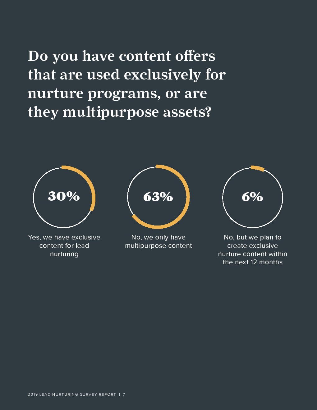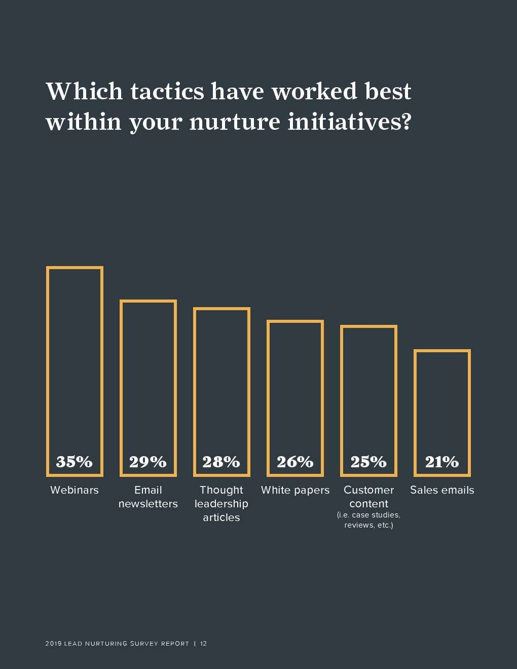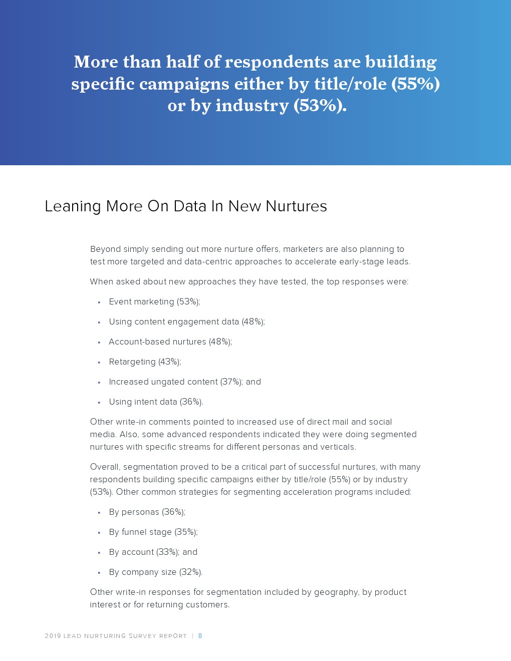 受访者还使用内容参与度数据(48%)、基于帐户的培养(48%)、重定向目标(43%)和使用意图数据(37%)进行测试。超过1/3的受访者(36%)表示,他们在潜在客户培养计划中增加了非封闭式内容的使用。