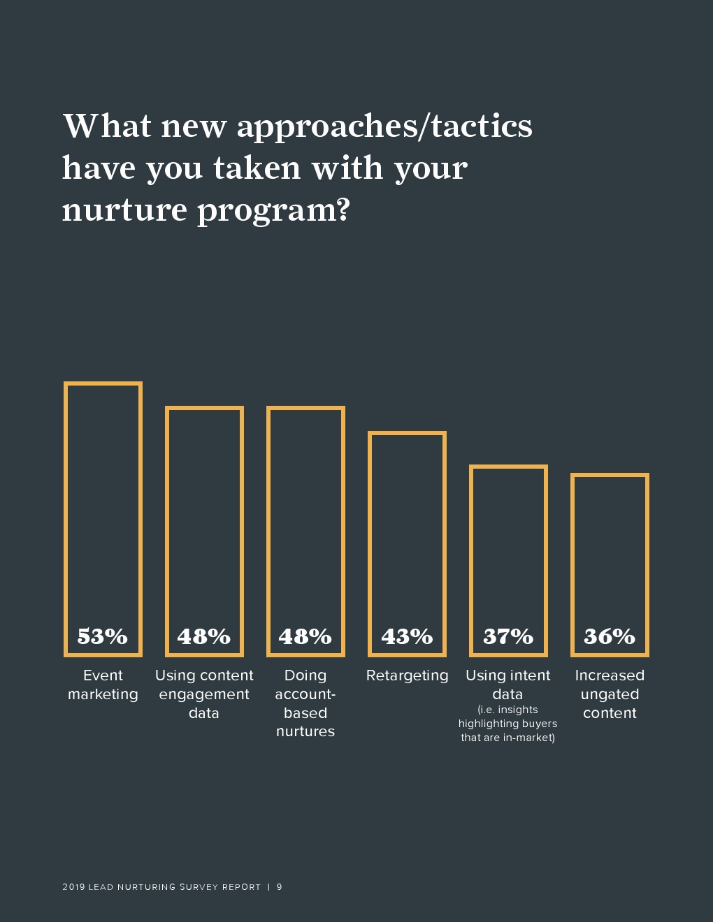 那么,B2B营销人员在潜在客户培养计划中使用了什么新的方法或策略呢?由于面对面活动被认为是最成功和特别有效的B2B需求生成策略之一,超过一半的受访者(53%)测试事件营销以加快早期销售线索的生成。