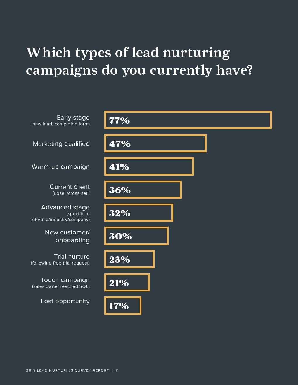 大多数受访者(77%)目前正在进行早期潜在客户培养活动,不到一半的受访者(47%)在进行合格的潜在客户培养活动。受访者还使用其他潜在客户培养活动,如热身活动(41%)、当前客户(36%)和高级活动(32%)。