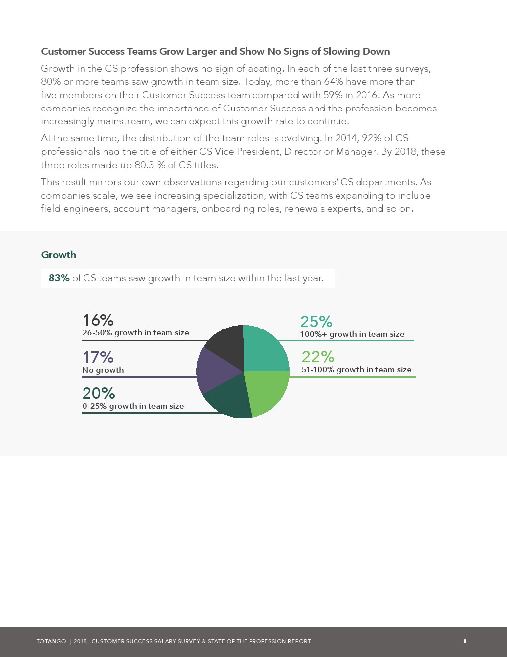 客户成功的功能正在迅速增长,79%的部门在过去一年中增加了人手。总共有30%的团队扩张了50%以上,大约1/8的团队(12%)的规模增长了一倍以上。