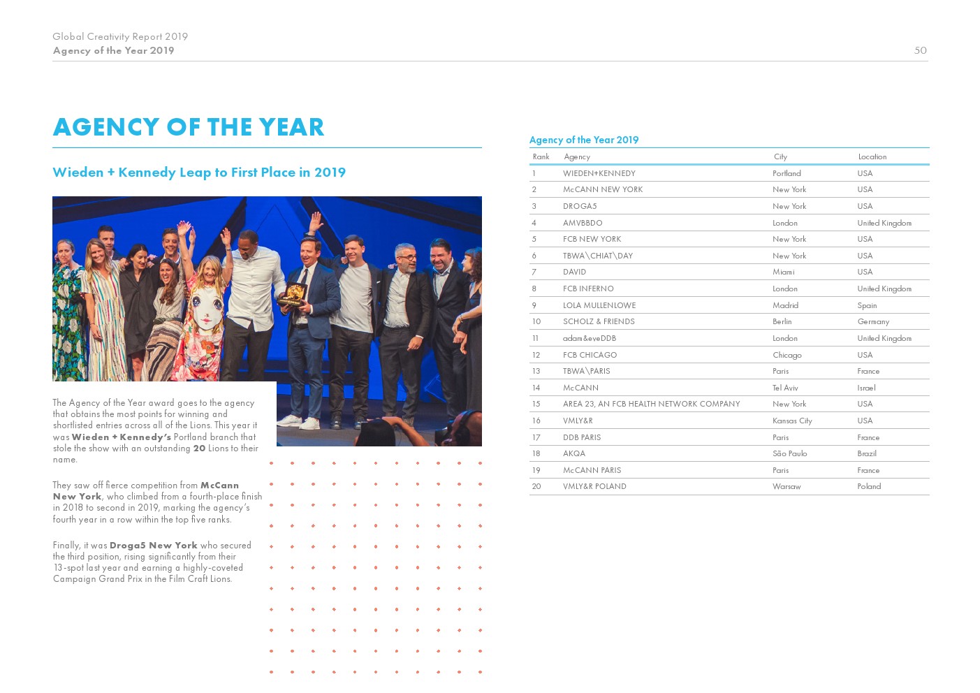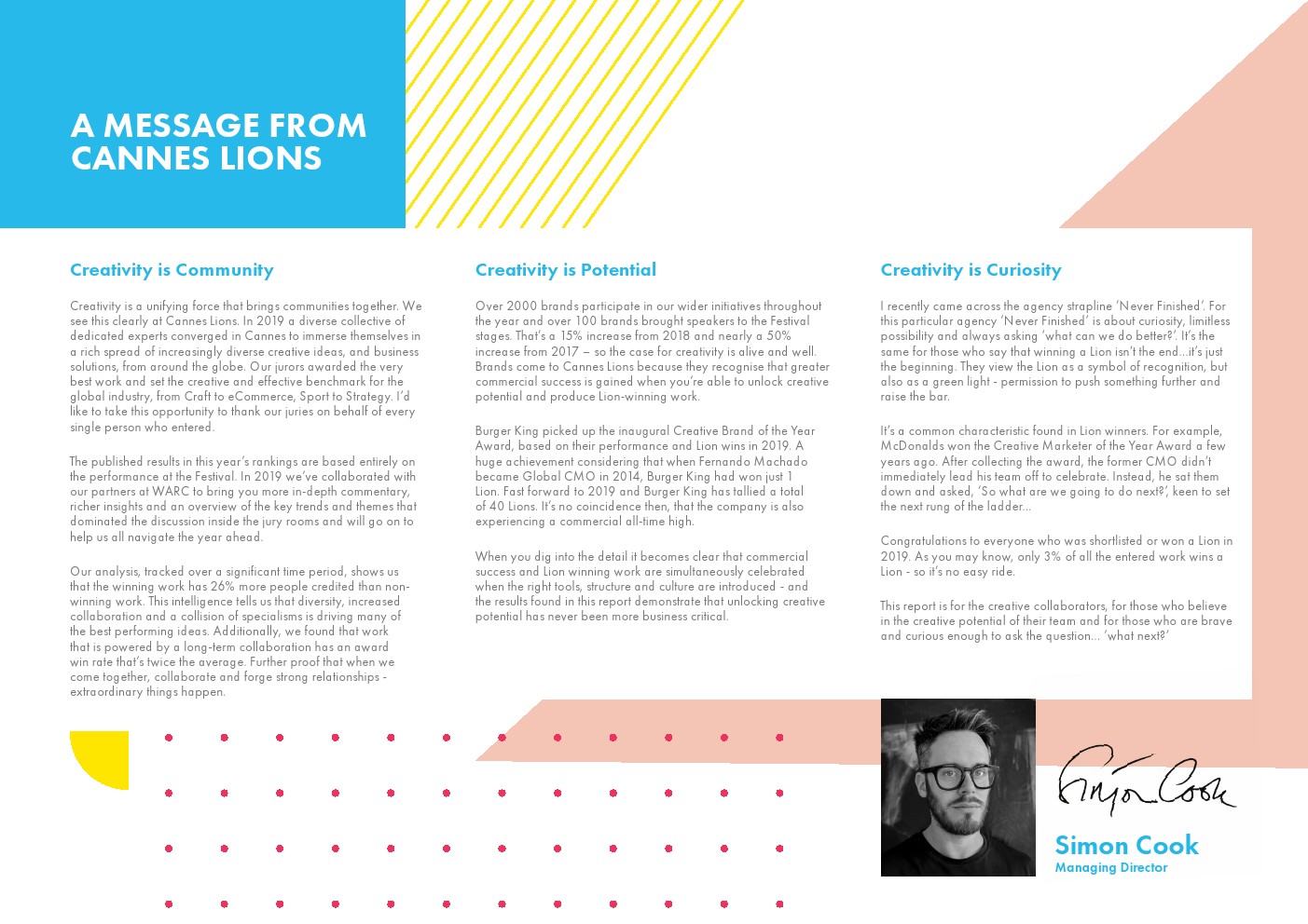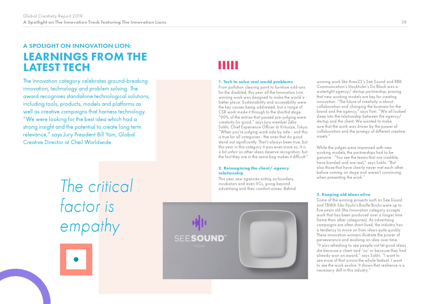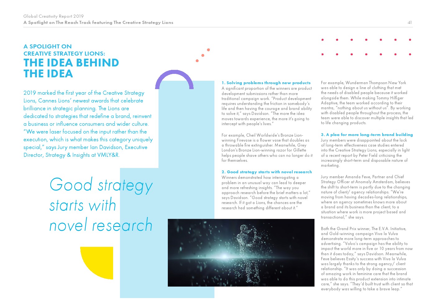 Cannes Lions的分析显示,优胜作品的创作团队比不成功的作品的团队多26%的工作人员。这种智慧告诉我们,多样性、增强协作和专业冲突正对创新至关重要。此外,由长期合作推动的作品的获奖率是平均水平的两倍。进一步证明,协作并建立牢固的关系时非凡的事情就会发生。