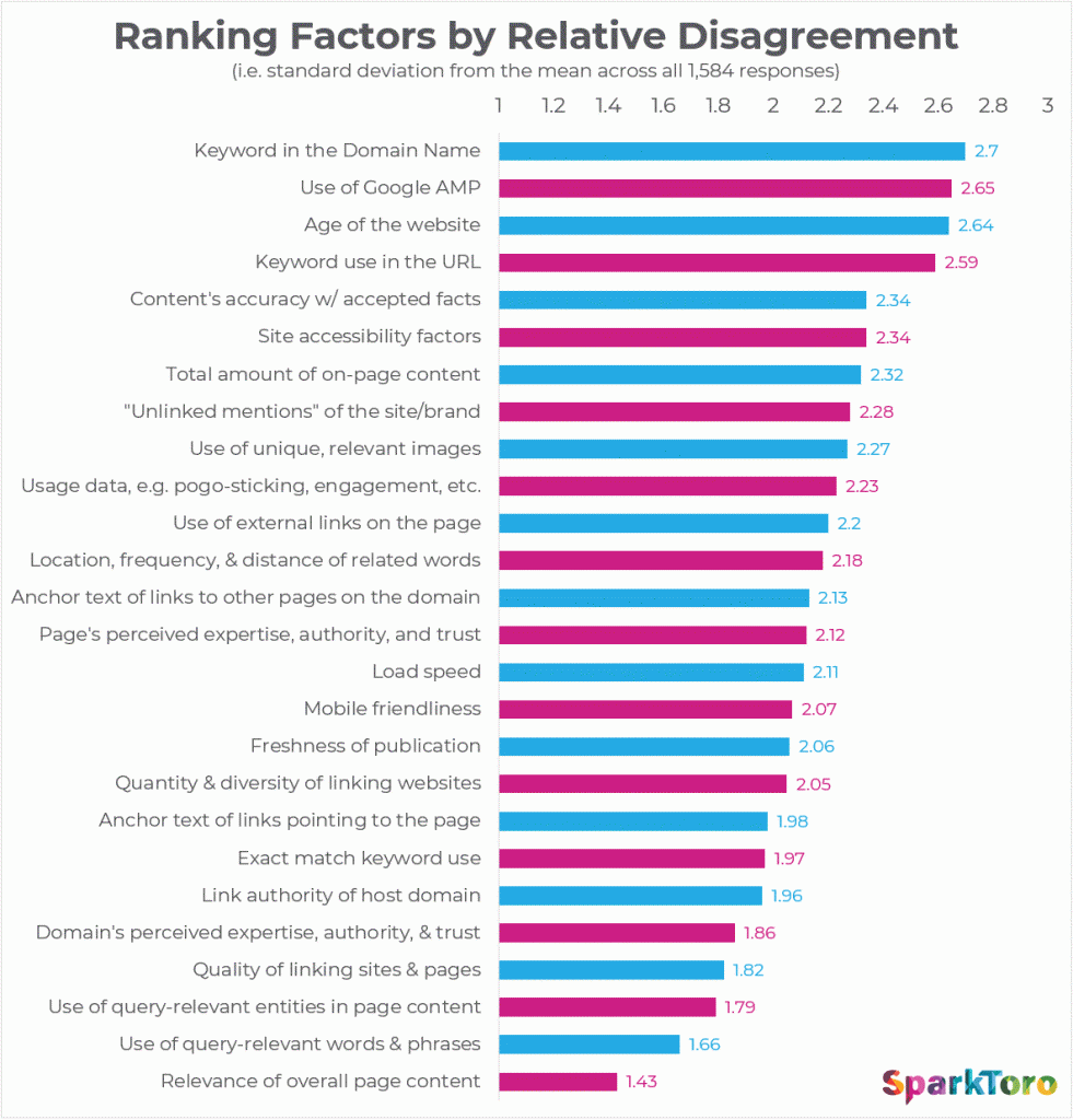 正如预期的那样,围绕排名靠前的因素存在着相对的共识,并且在列表的底部有更多的分歧。这表明,一些SEO从业者仍然认为域名中关键字和网站的年龄等因素有影响力,而其他人认为他们几乎没有影响。