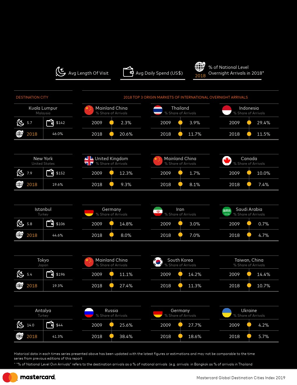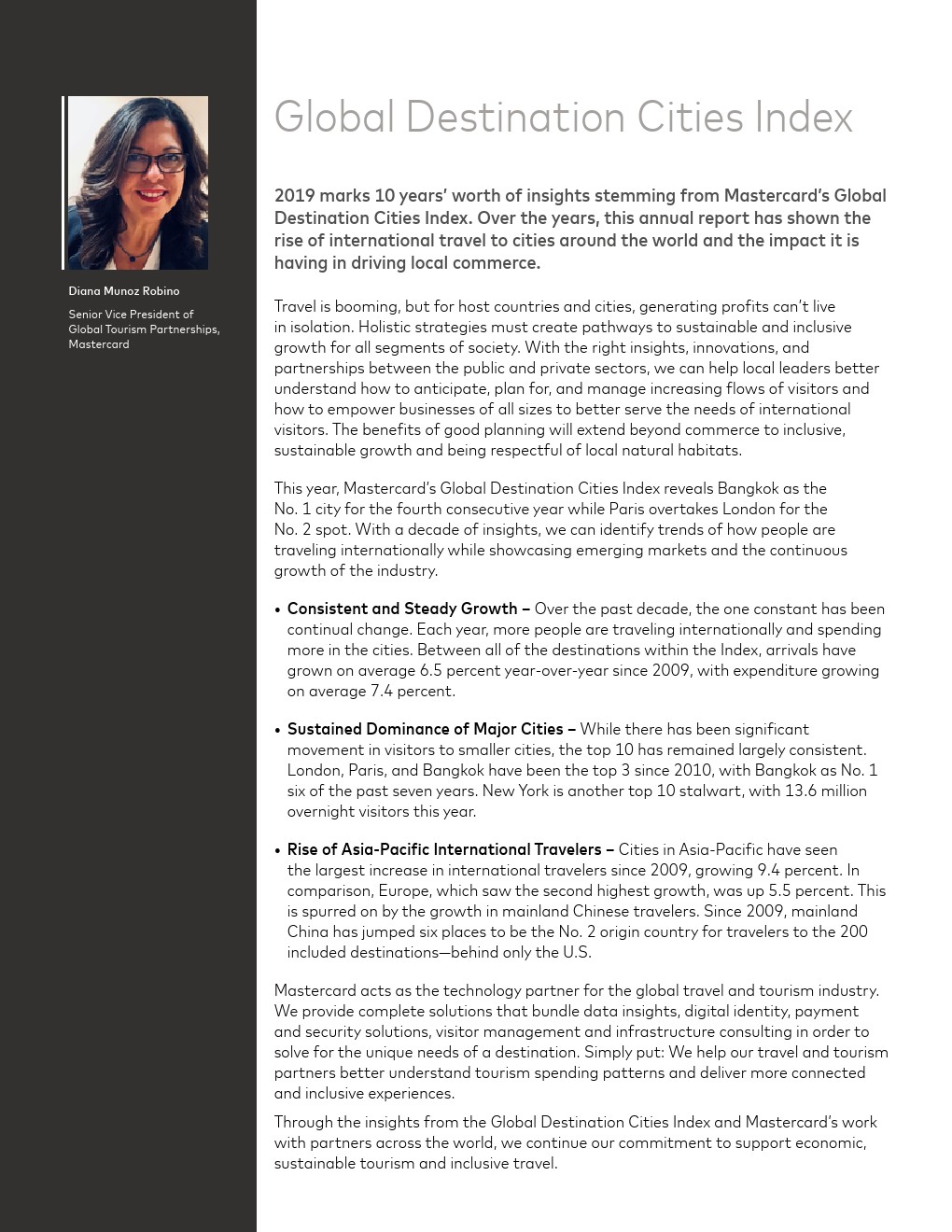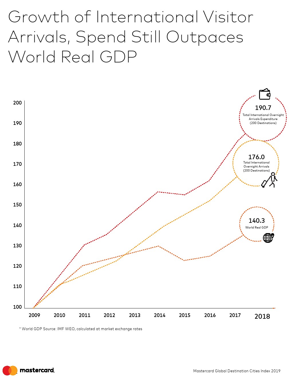 持续稳定的增长。过去十年,一个不变的因素是持续变化。每年,有更多的人出国旅行,并在城市中消费。自2009年以来,指数覆盖的所有目的地之间,入境游客数量平均每年增长6.5%,支出平均增长7.4%。