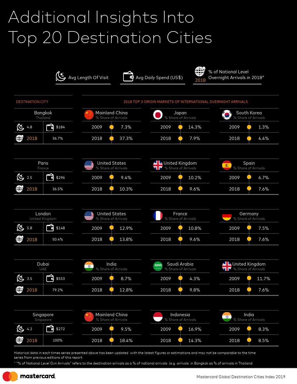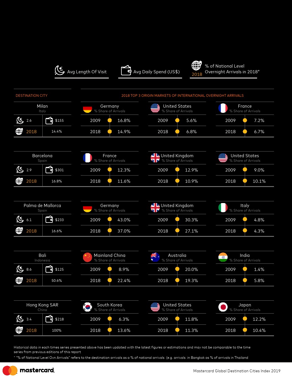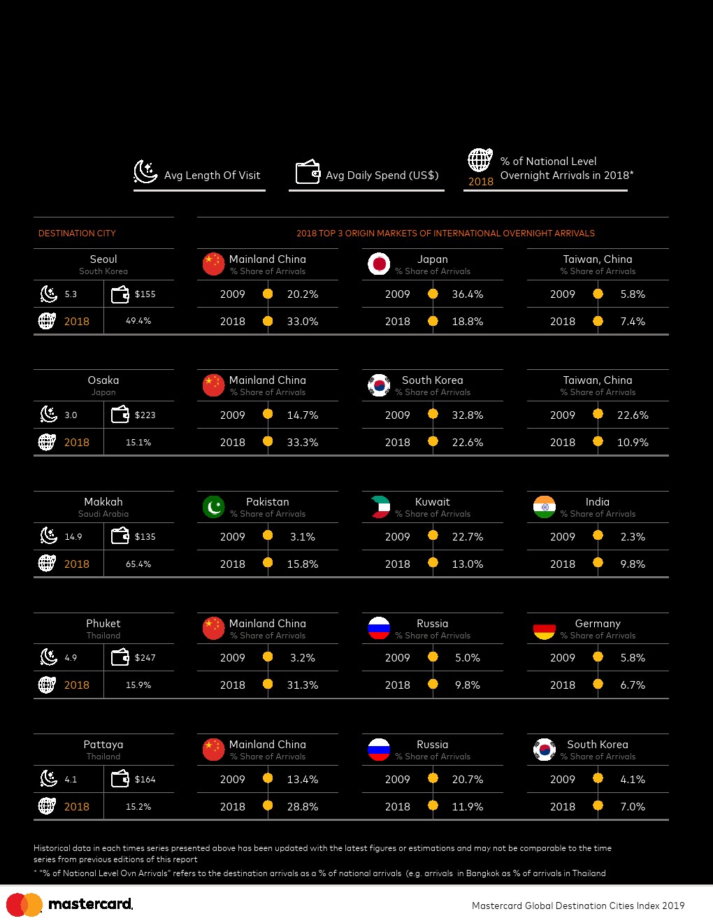 持续稳定的增长。过去十年,一个不变的因素是持续变化。每年,有更多的人出国旅行,并在城市中消费。自2009年以来,指数覆盖的所有目的地之间,入境游客数量平均每年增长6.5%,支出平均增长7.4%。