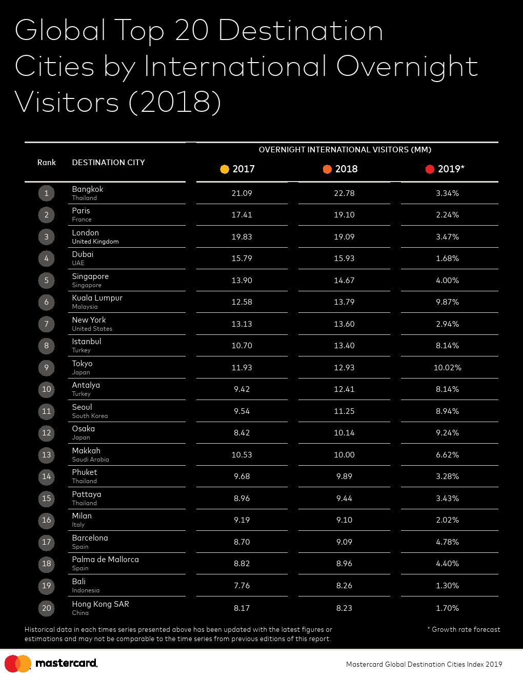 主要城市保持统治地位。尽管小城市的游客人数明显增长,但十强城市的游客人数基本保持一致。自2010年以来,伦敦、巴黎和曼谷一直位居前三,曼谷在过去七年中排名前六。纽约是一直是前十名,今年的过夜游客数量为1,360万人。