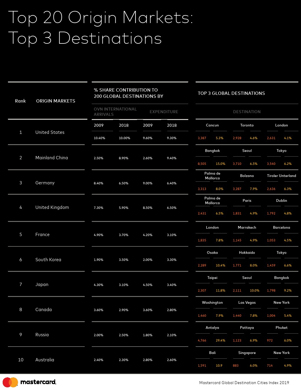 亚太地区国际旅游的崛起。自2009年以来,亚太城市的国际旅客增长幅度最大,增长了9.4%;其次是欧洲(5.5%)。中国大陆旅客人数的增长推动了这一点。自2009年以来,中国大陆已跃升六位,成为前往200个目的地的第二大原籍国,仅次于美国。