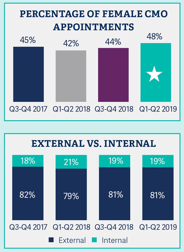 迄今为止,2019年营销高管职位中有近一半是女性,这是比例最高的一年。上半年新任命的CMO中有近80%以上是外部雇佣的,自2017年以来,3/5的CMO任命来自外部而不是内部晋升。这意味着下一代CMO可能需要更换雇主才能获得更高的职位。