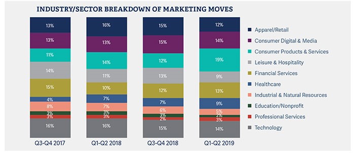 消费行业在营销活动中占很小的份额,占2019年上半年市场营销营业额的54%,低于2018年下半年(55%)。消费品和服务在过去六个月的增幅最大,从12%增长至19%。