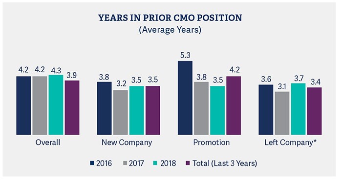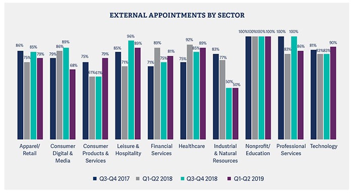 如前所述,大部分CMO是从外部雇佣的。消费品和服务部门外部任命的比例增幅最大,从前一年的61%增长至80%。