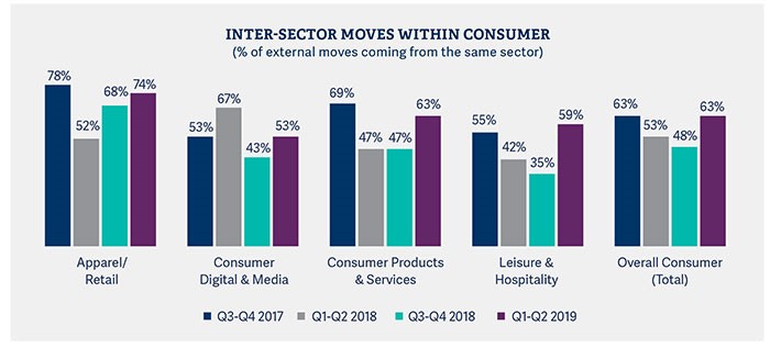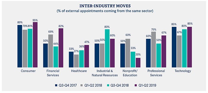 消费行业希望从其他面向消费者的组织中招聘营销人员,93%的外雇是来自行业内的。医疗保健和非营利行业则是最有可能从行业外部招聘营销人员的。