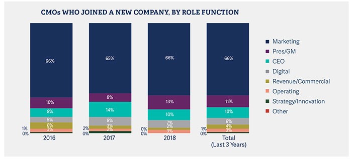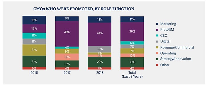 通常,市场营销负责人中有20%的机会在公司担任CMO职位。他们一旦被任命为CMO,他们就有大约20%的机会在内部晋升为更高的职位。