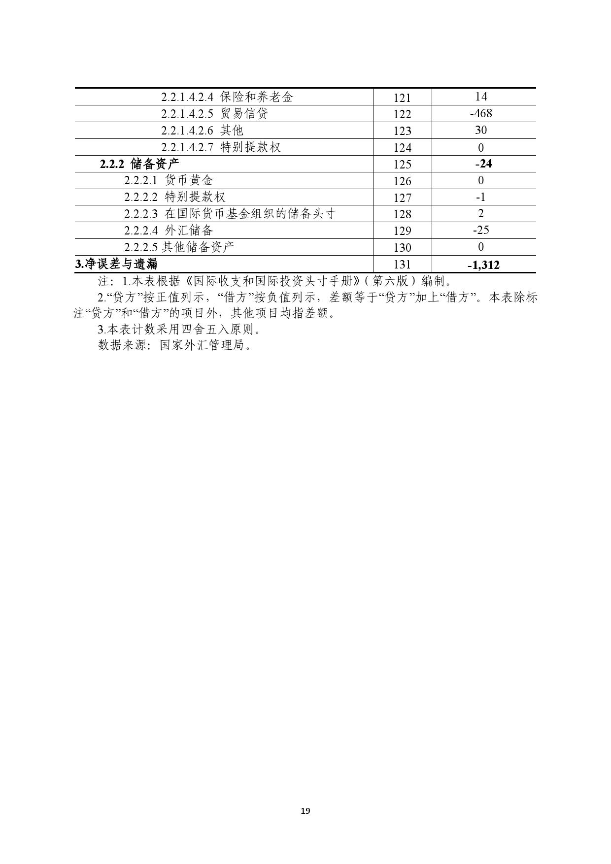 按美元计值,2019年二季度,我国经常账户顺差462亿美元,其中,货物贸易顺差1206亿美元,服务贸易逆差658亿美元,初次收入逆差119亿美元,二次收入顺差33亿美元。资本和金融账户顺差214亿美元,其中,资本账户逆差0.6亿美元,非储备性质的金融账户顺差138亿美元,储备资产减少76亿美元。