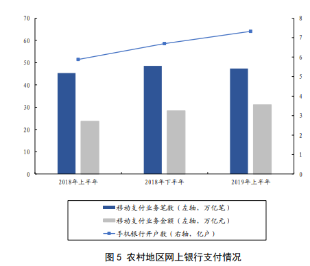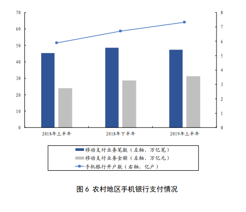 农村地区电子支付进一步推广,为农村电商发展提供支撑。2019年上半年,农村地区发生网银支付业务63.54亿笔、金额 74.27 万亿元,发生移动支付业务 47.35 亿笔、金额31.17 万亿元;银行机构办理农村电商支付业务 3.57 亿笔、金额 4030.33 亿元;银行卡助农取款服务点发生支付业务(含取款、汇款、代理缴费)2.14 亿笔、金额 1813.25 亿元。