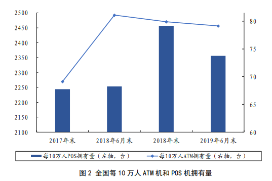 物理可得性是普惠金融的关键要素之一,物理机具的广泛布设为民众获得便捷的金融服务打下了基础。截至 2019 年6 月末,我国每 10 万人拥有 ATM 机 79 台,显著高于亚太地区平均水平的 63 台;我国每 10 万人拥有 POS 机 2356 台,较 2014 年末实现翻倍。