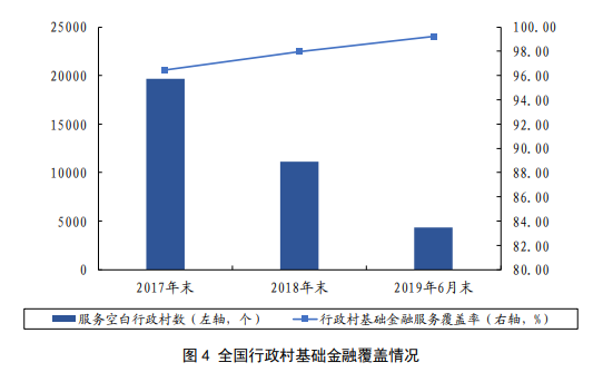 截至 2019 年 6 月末,全国乡镇银行业金融机构覆盖率为 95.65%,行政村基础金融服务覆盖率 99.20%,比 2014 年末提高 8.10个百分点;全国乡镇保险服务覆盖率为 95.47%。银行卡助农取款服务点已达 82.30 万个,多数地区已基本实现村村有服务。