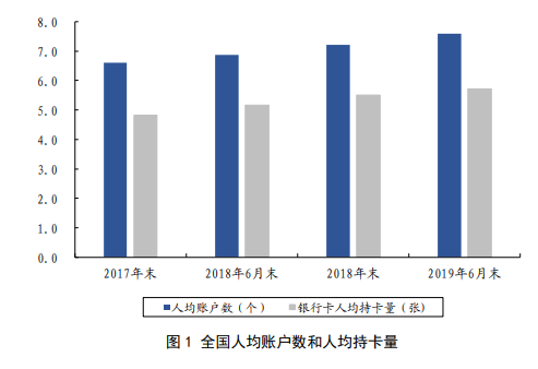 账户和银行卡的普及是民众获得金融服务、消除“金融排斥”的第一步。目前我国人均拥有的银行账户数和持卡量均处于发展中国家领先水平。截至 2019 年 6 月末,我国人均拥有 7.6 个银行账户、持有 5.7 张银行卡,较 2014 年末分别提高 60%和 50%。