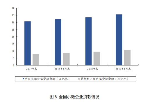 小微企业金融服务实现增量、扩面、降本、控险平衡发展。截至2019年6月末,全国小微企业贷款余额35.63万亿元,其中普惠型小微企业贷款(单户授信总额1000万元及以下的小微企业贷款)余额10.7万亿元,较年初增长14.27%,比各项贷款增速高7.14个百分点;有贷款余额户数1988.31万户,较年初增加265.08万户。