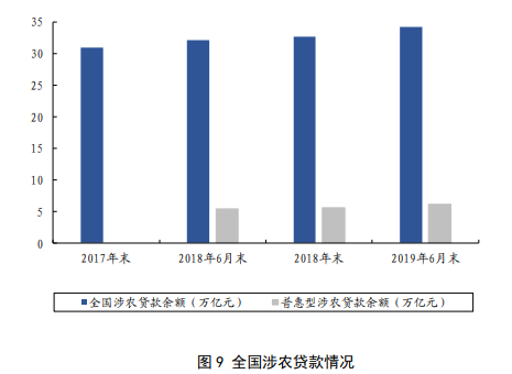 金融支持乡村振兴力度不断加大。截至2019年6月末,全国涉农贷款余额34.24万亿元,其中,农户贷款余额9.86万亿元。普惠型涉农贷款余额6.10万亿元,占全部涉农贷款的17.80%,较年初增长8.24%,高于各项贷款平均增速1.11个百分点。2019年上半年,全国农业保险为1.17亿户次农户提供风险保障约2.57万亿元,为1500.52万户次受灾农户支付赔款203.09亿元。