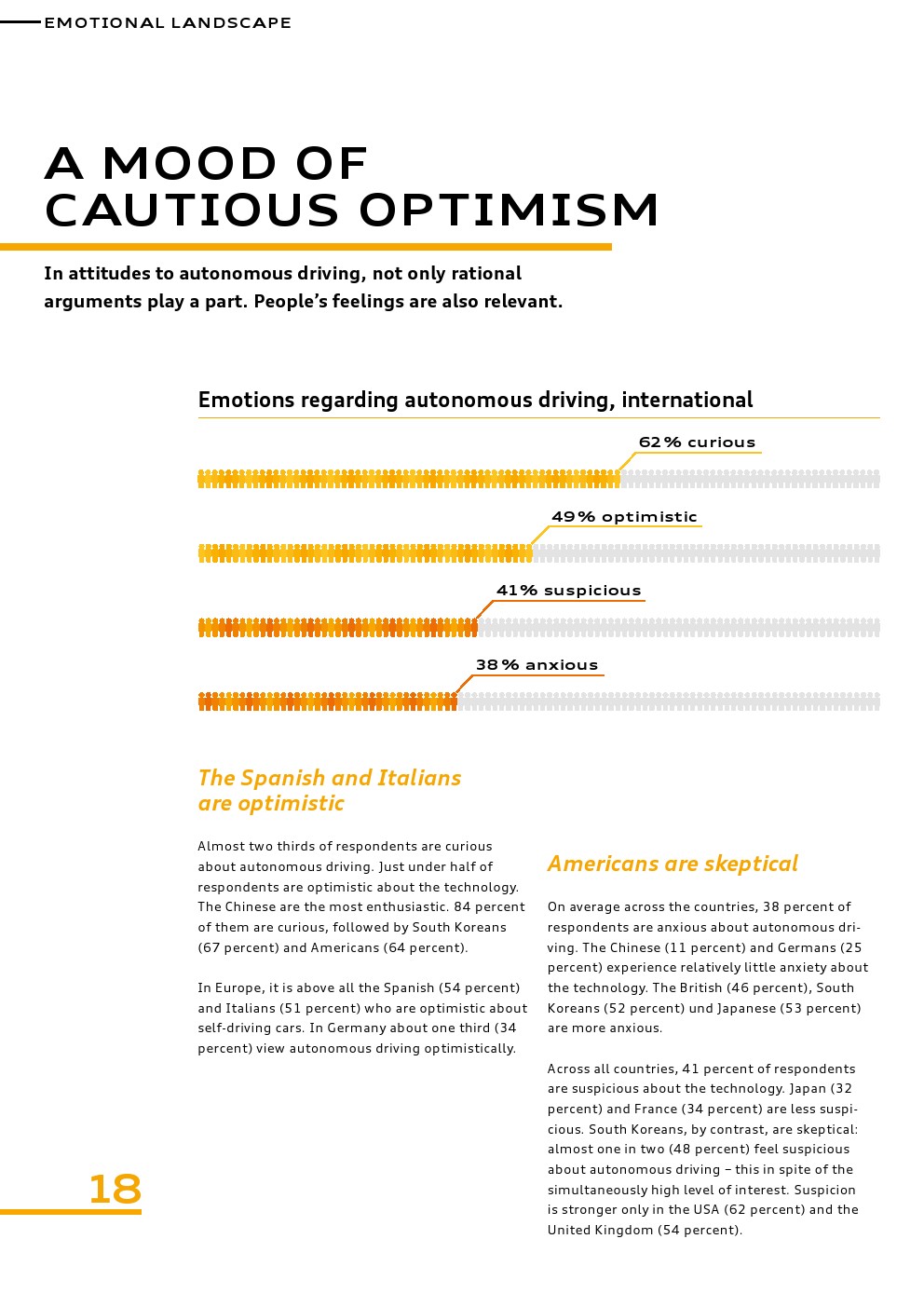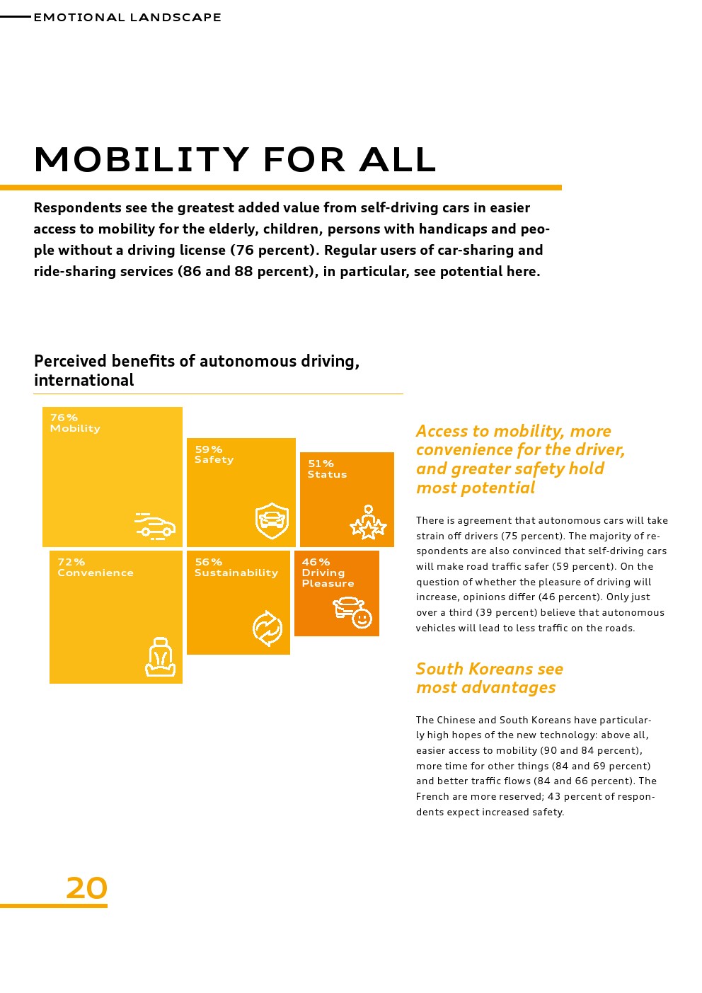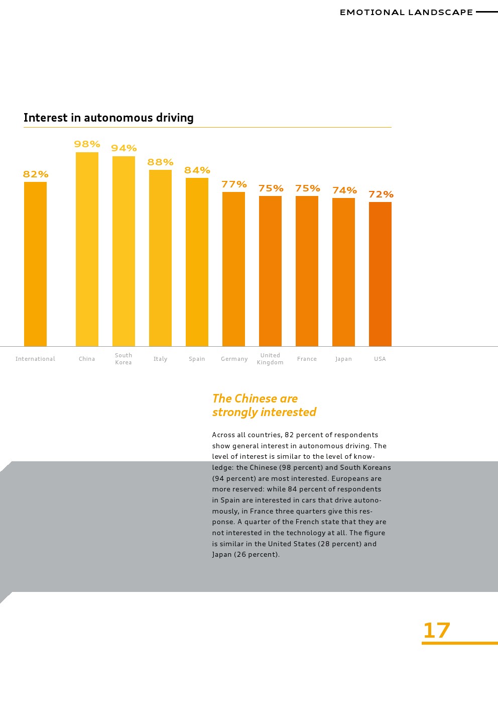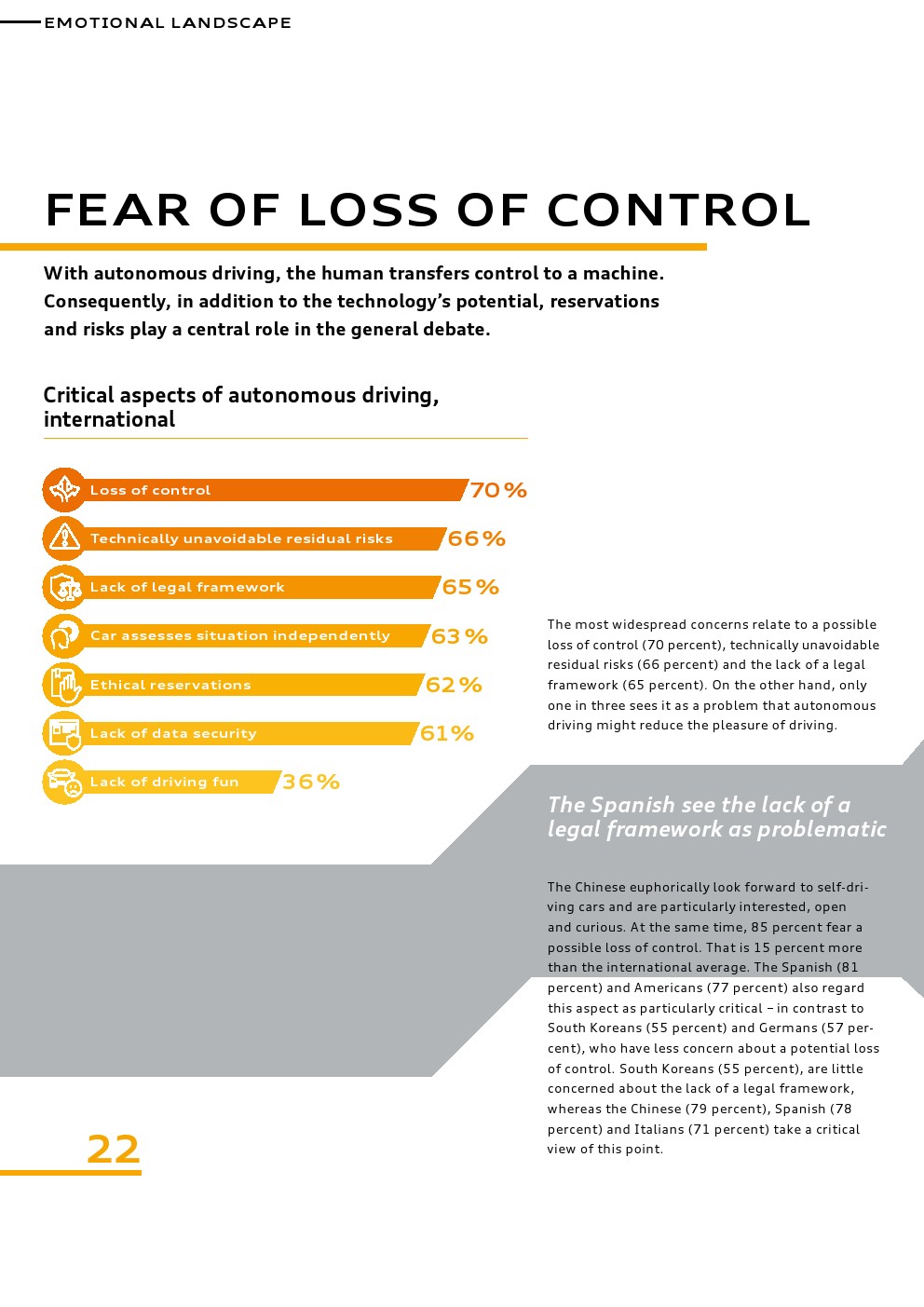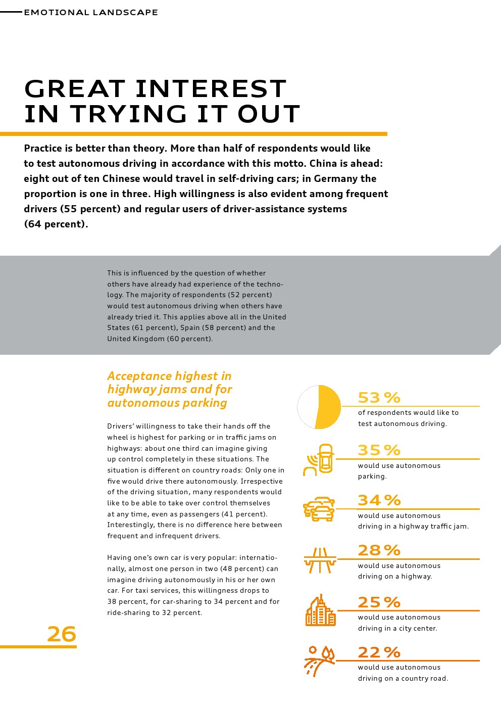 所有国家的受访者都对自动驾驶表现出极大的兴趣(82%)和很高的好奇心(62%)。他们在新技术中看到了个人和社会的潜力:从更容易移动(76%)到更方便(72%)和更安全(59%)。超过一半的受访者愿意尝试自动驾驶。放弃控制的最大意愿是在高速公路上的自动停车和交通拥堵中驾驶。尽管如此,也存在一些担忧,首先是关于失去控制(70%)和技术上无法避免的风险(66%)。只有8%的受访者表示他们可以解释自动驾驶。