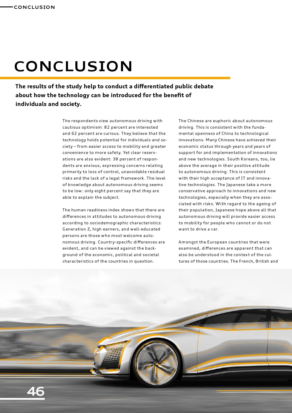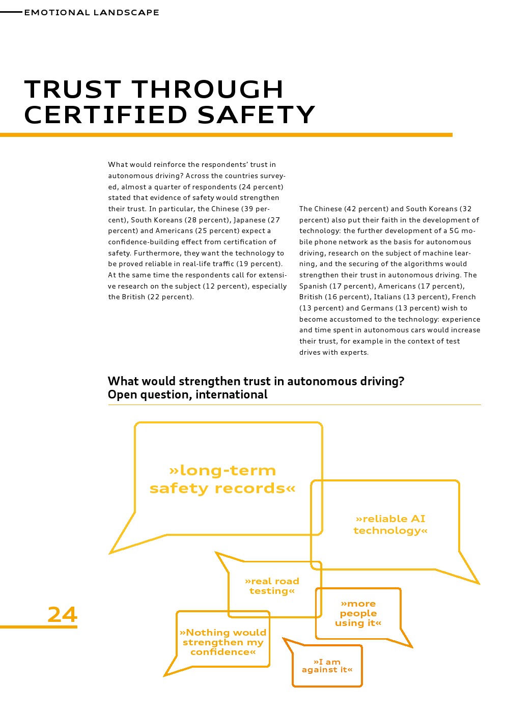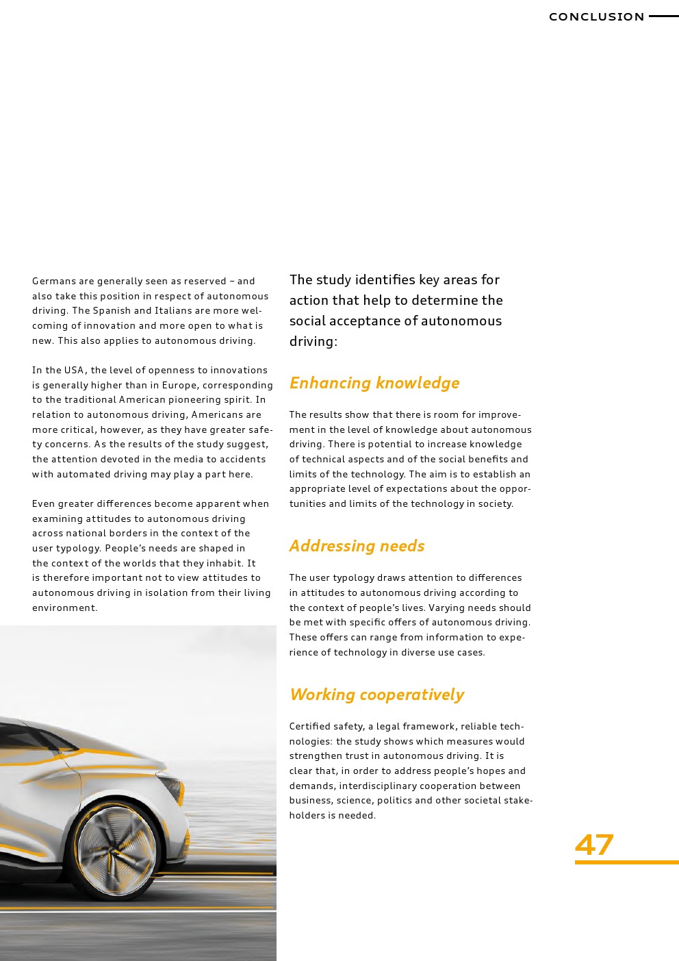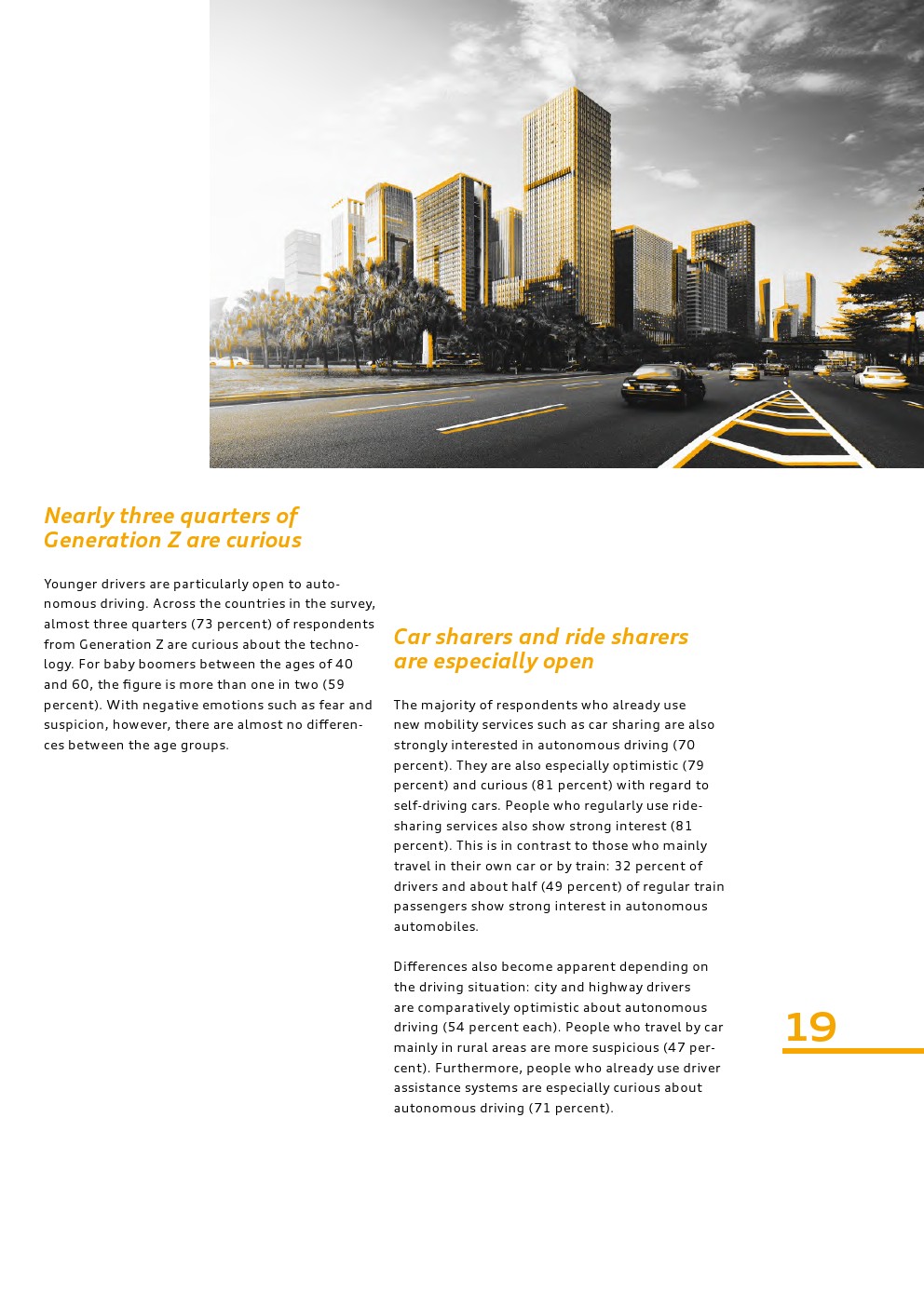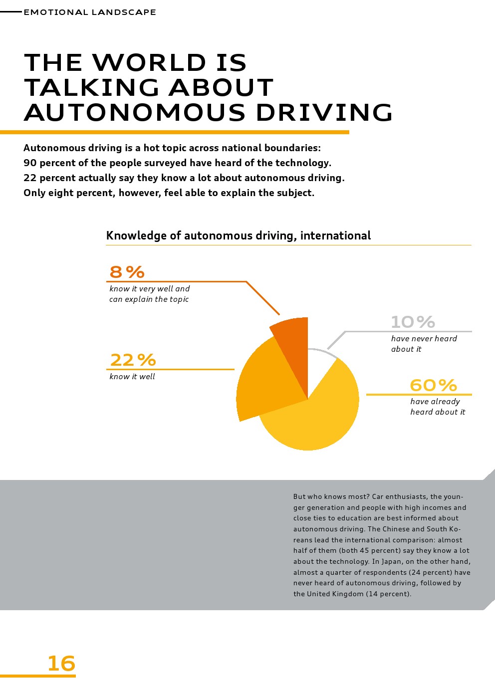 所有国家的受访者都对自动驾驶表现出极大的兴趣(82%)和很高的好奇心(62%)。他们在新技术中看到了个人和社会的潜力:从更容易移动(76%)到更方便(72%)和更安全(59%)。超过一半的受访者愿意尝试自动驾驶。放弃控制的最大意愿是在高速公路上的自动停车和交通拥堵中驾驶。尽管如此,也存在一些担忧,首先是关于失去控制(70%)和技术上无法避免的风险(66%)。只有8%的受访者表示他们可以解释自动驾驶。