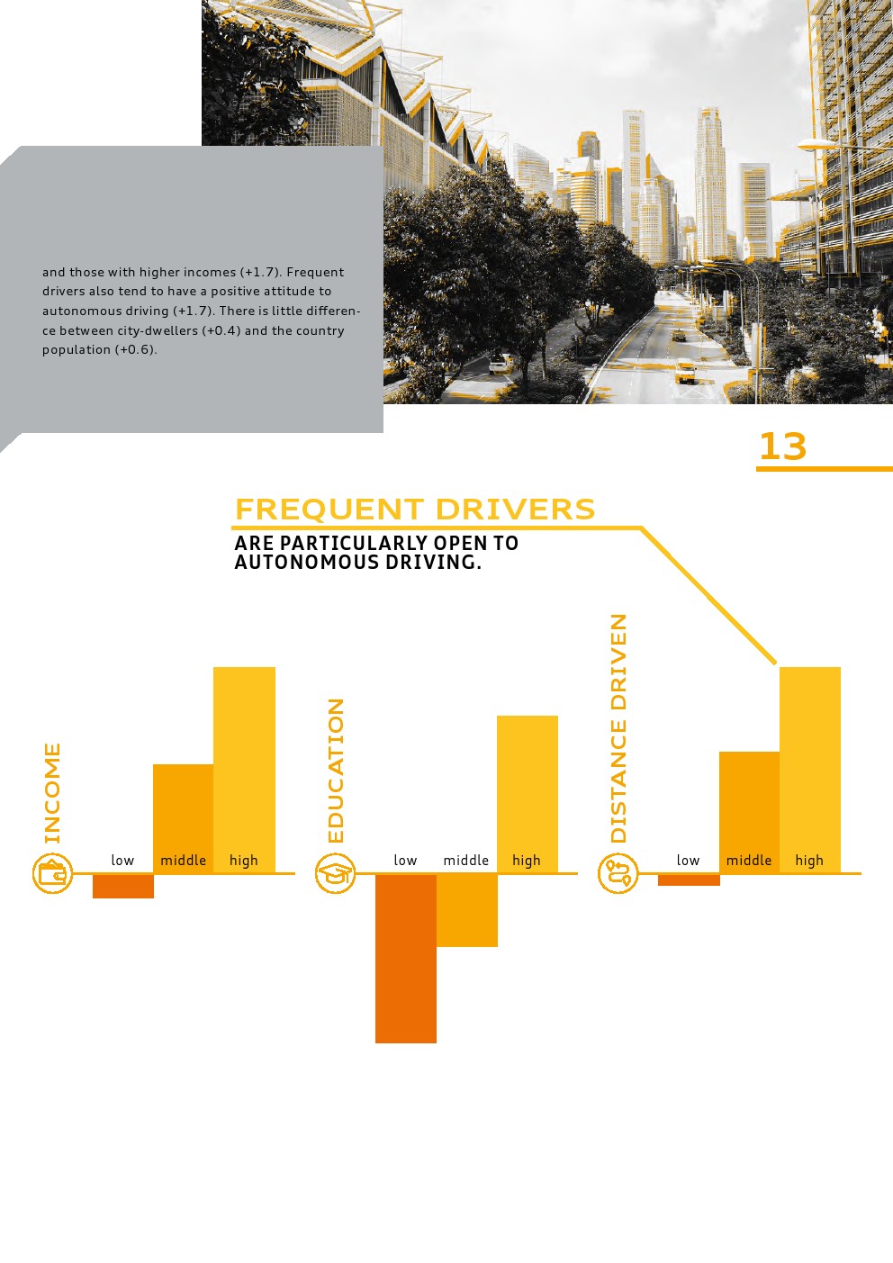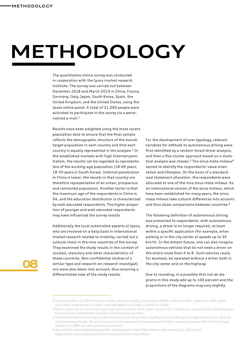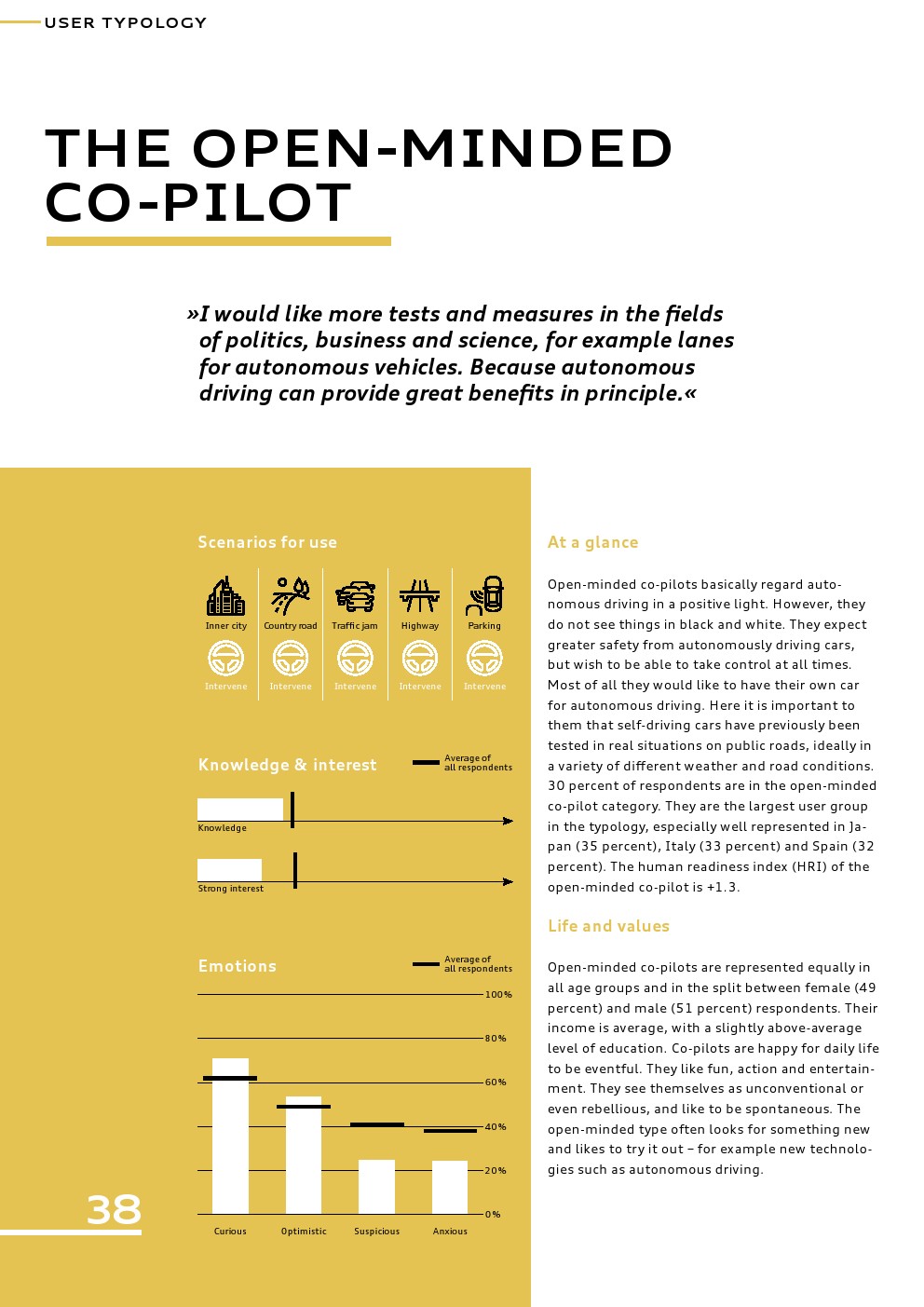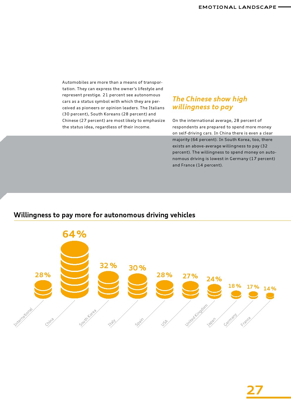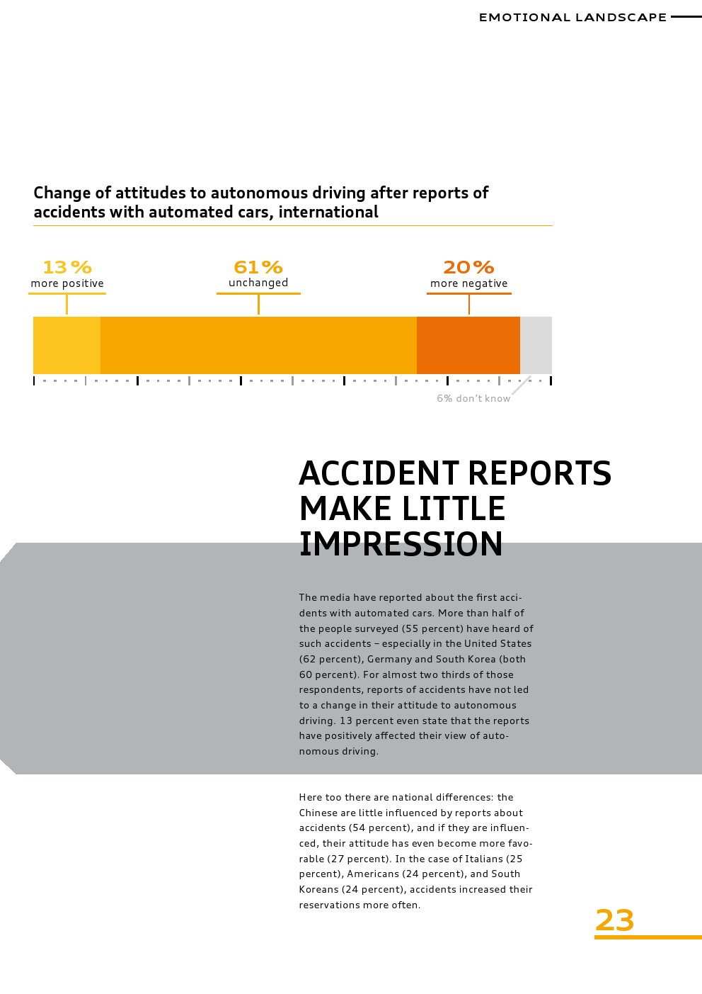 所有国家的受访者都对自动驾驶表现出极大的兴趣(82%)和很高的好奇心(62%)。他们在新技术中看到了个人和社会的潜力:从更容易移动(76%)到更方便(72%)和更安全(59%)。超过一半的受访者愿意尝试自动驾驶。放弃控制的最大意愿是在高速公路上的自动停车和交通拥堵中驾驶。尽管如此,也存在一些担忧,首先是关于失去控制(70%)和技术上无法避免的风险(66%)。只有8%的受访者表示他们可以解释自动驾驶。