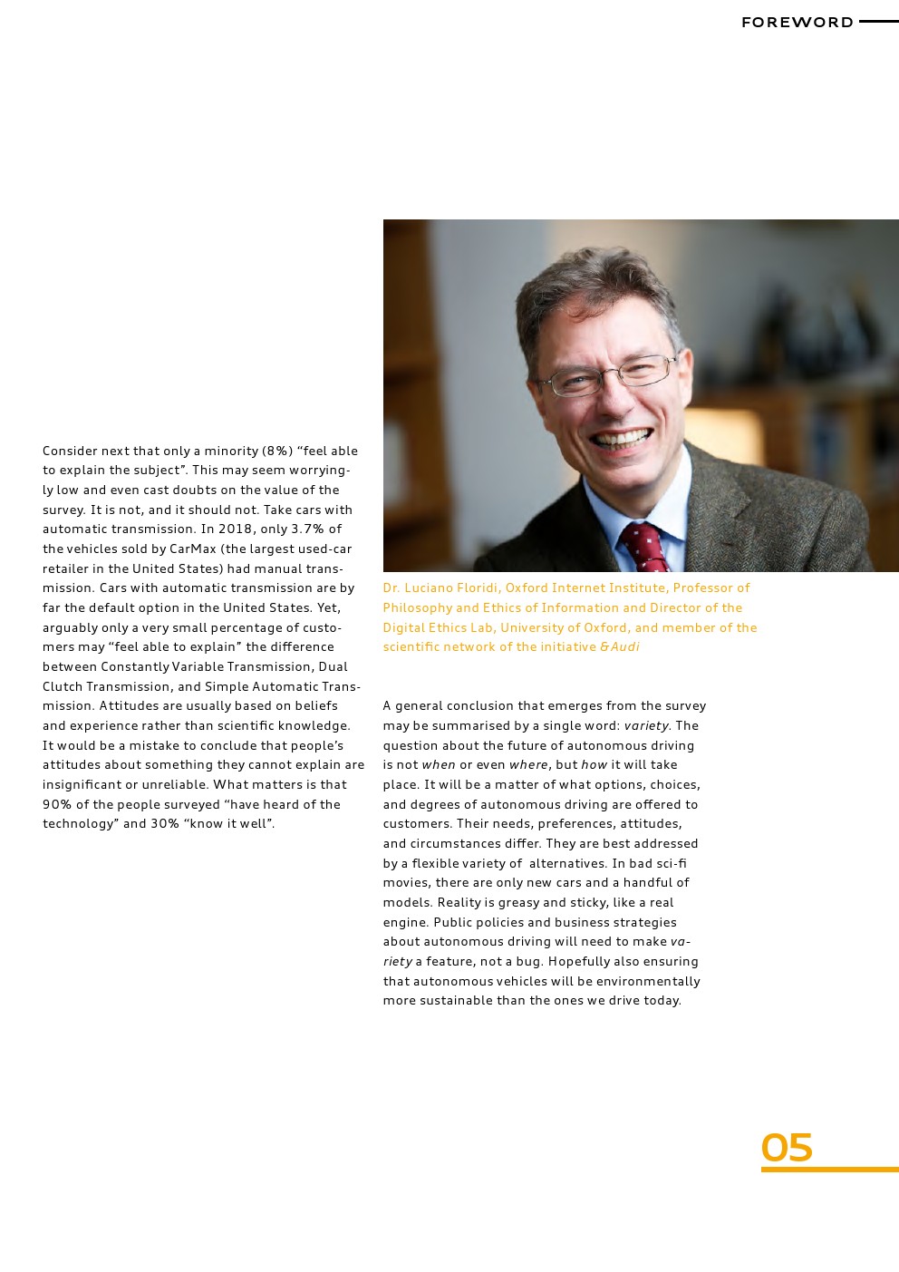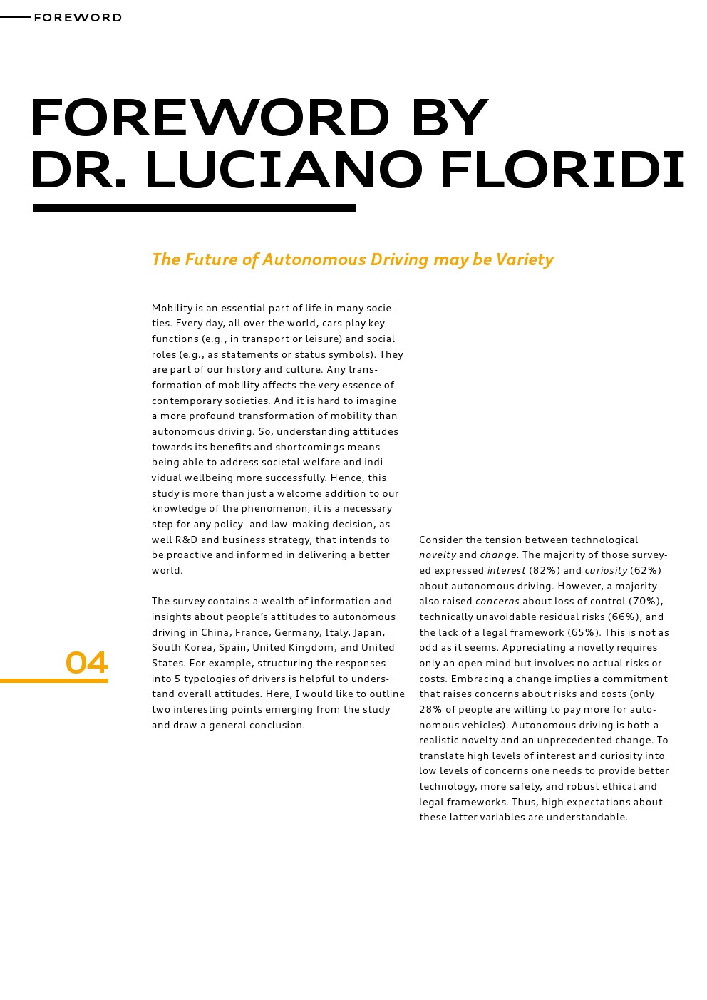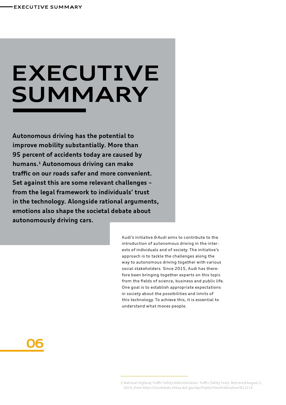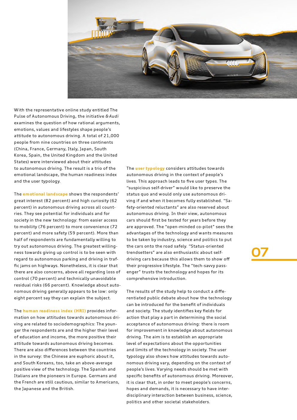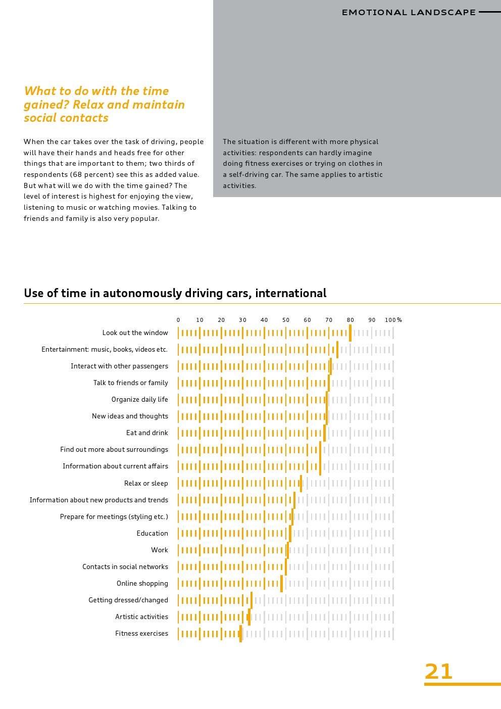 所有国家的受访者都对自动驾驶表现出极大的兴趣(82%)和很高的好奇心(62%)。他们在新技术中看到了个人和社会的潜力:从更容易移动(76%)到更方便(72%)和更安全(59%)。超过一半的受访者愿意尝试自动驾驶。放弃控制的最大意愿是在高速公路上的自动停车和交通拥堵中驾驶。尽管如此,也存在一些担忧,首先是关于失去控制(70%)和技术上无法避免的风险(66%)。只有8%的受访者表示他们可以解释自动驾驶。