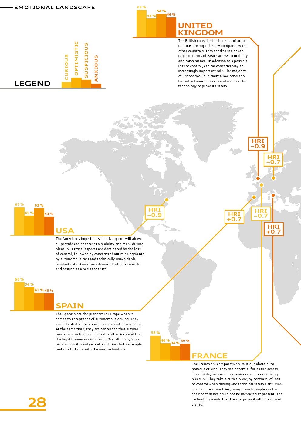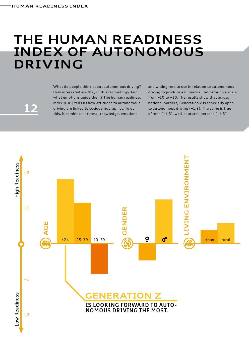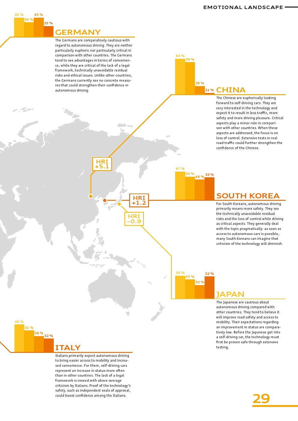 HRI提供了关于自动驾驶的态度与人口统计的相关性:受访者越年轻,他们的教育水平和收入水平越高,对自动驾驶的态度就越积极。国家之间也存在差异:中国人对此欣喜若狂;韩国人也对这项技术持积极看法;西班牙人和意大利人是欧洲的先驱;德国人、法国人、美国人、日本人和英国人保持谨慎。