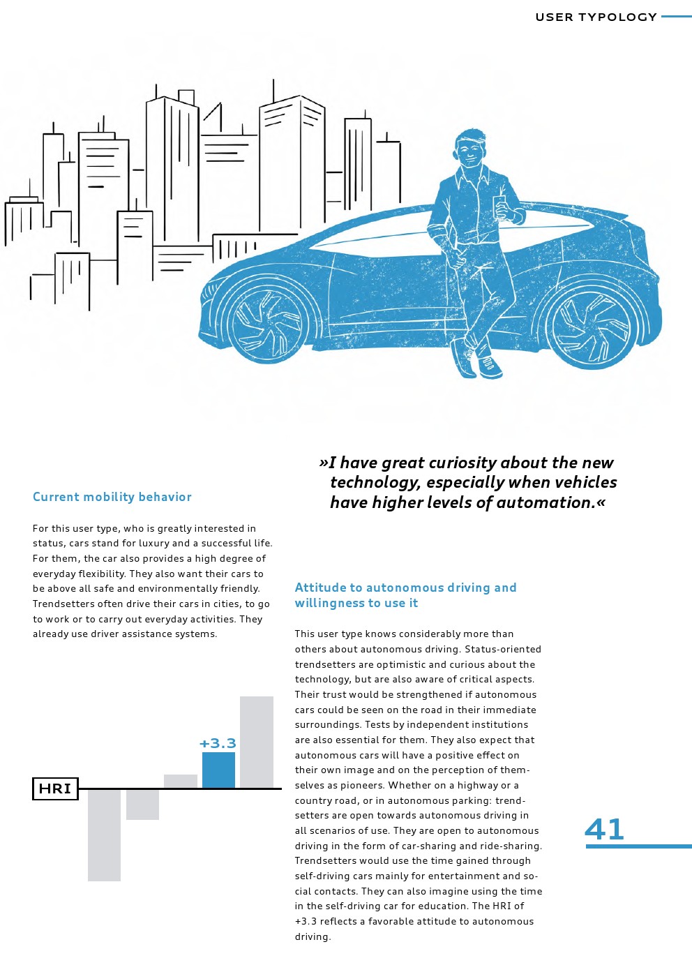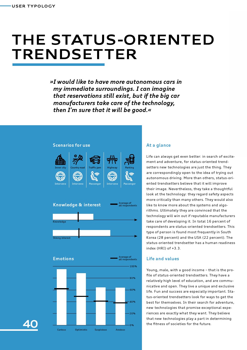 “以地位为导向的潮流引领者”也对自动驾驶汽车充满热情,因为这能够展示他们进步的生活方式。