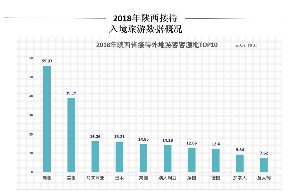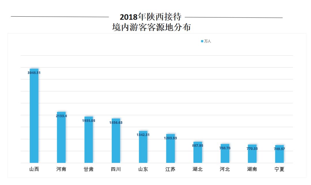 2018年,陕西省省内游客占全省接待总量的63.15%;接待省外游客23063.74万人次,同比增长27.70%,占比提高2.05个百分点。在省外游客中,山西、河南、甘肃和四川四省接待量达9873.59万人次,占比最高,达42.81%。我省前十位主要客源地依次为:山西3948.51万人次(占17.12%)、河南2133.40万人次(占9.25%)、甘肃1935.05万人次(占8.39%)、四川1856.63万人次(占8.05%)、山东1342.31万人次(占5.82%)、江苏1203.93万人次(占5.22%)、湖北887.95万人次(占3.85%)、河北788.78万人次(占3.42%)、湖南770.33万人次(占3.34%)、宁夏749.57万人次(占3.25%),上述10个省份的接待量占来陕游客的比重达67.71%,同比上升0.12%;其中,位次较上年提前的省份是江苏(由第9位提升到第6位)和宁夏(由第22位提升到第10位)。