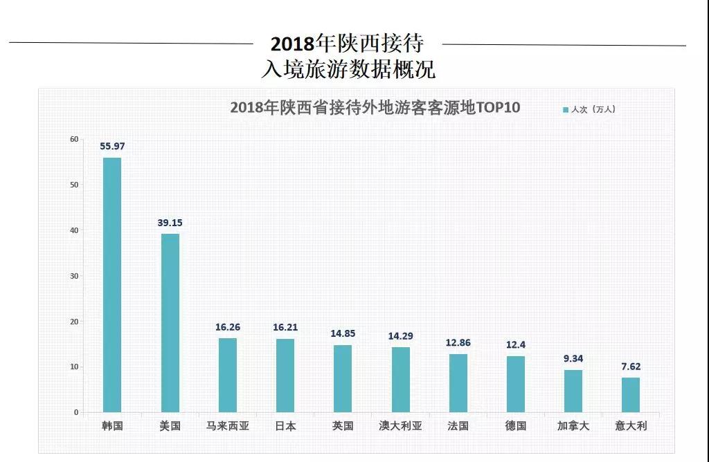 从近五年接待游客数据来看,全省接待境内外游客呈上升趋势。全省接待游客增长率在2018年达到最高,与接待境内游客增长率保持一致,接待境外游客增长率2016年最高。这说明2018年陕西省接待游客的增长率主要来自于国内市场,2019要继往开来,继续保持高增长率,除了继续加大在国内的吸引力,境外市场的开拓也是一个重要发力点。