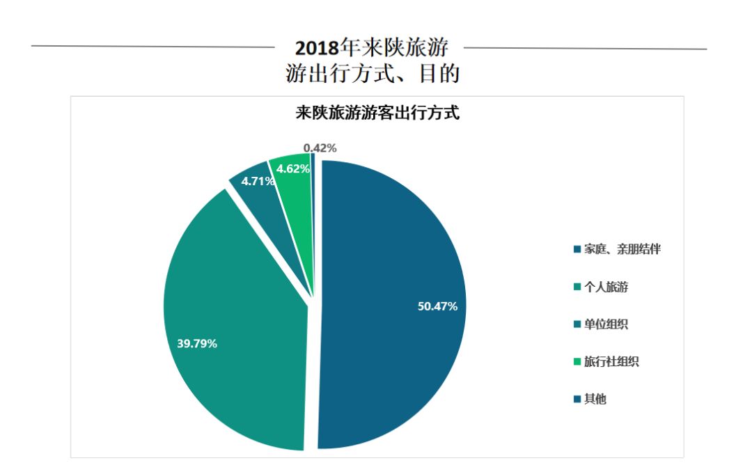 按旅游者出游方式划分,家庭或者亲朋结伴占比最多,为50.47%,其后依次为:个人旅行占39.79%,单位组织占4.71%,旅行社组织占4.62%,其他出游方式占0.42%。其中,个人旅行较上年提高10.28个百分点。