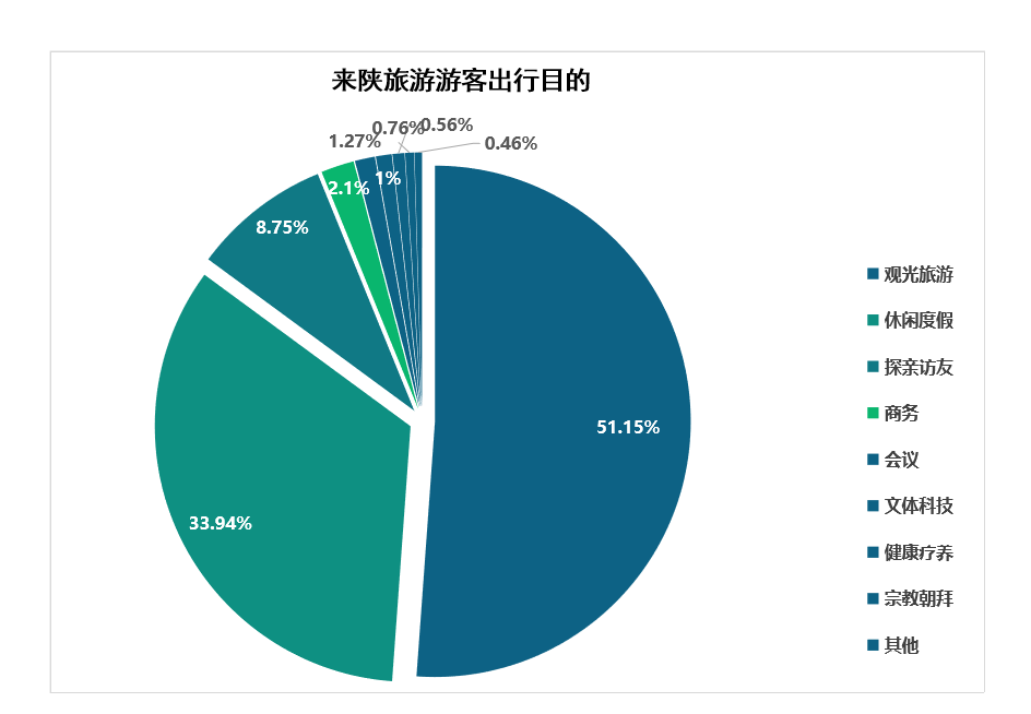 按旅游目的划分,休闲度假占来陕游客总人数的33.94%,观光游览占51.15%,探亲访友占8.75%,商务占2.1%,会议占1.27%,文体科技占1.00%,健康疗养占0.76%,宗教朝拜占0.56%,其他占0.47%。其中,休闲度假、观光游览和探亲访友较上年分别提高3.37、2.06和0.94个百分点。
