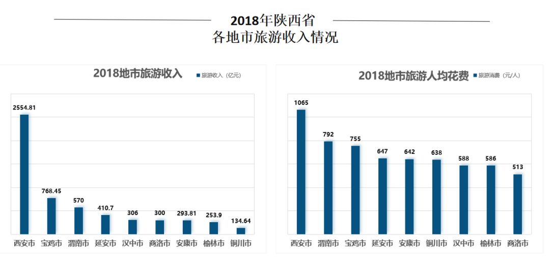 结合地市接待人数以及人均消费可以看出一个城市旅游产业的发展程度。接待游客数量多、人均花费越高,说明城市旅游产业发展较为成熟和完善,以西安市为代表。接待游客数量多,人均消费少,说明城市旅游资源较为丰富,但经营管理能力稍有欠缺,以商洛市为代表。接待游客数量少,人均消费少,说明城市整体旅游产业较为不发达,旅游资源少,经营管理能力也需要提升,以榆林市为代表。
