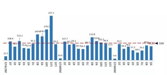 2019年9月份购买分指数为82.1,预计10月份消费者实际购买意愿下降。