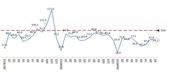 2019年10月9日,中国汽车流通协会发布最新一期“汽车消费指数”:2019年9月汽车消费指数为65.2,预计10月份销量较9月份有所下降,10月份虽为汽车市场传统旺季,但是受到宏观经济下行的压力以及国五国六切换等因素的影响,市场预期比去年同期销量略有下降。