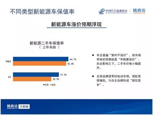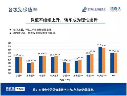 整体上,9月二手车价格和新车价格都有小幅度回升,倾销库存的情况已经减少很多,所以我们看到9月份的保值率变化并不大,整体表现较平稳,呈稳步上升趋势,轿车的保值率回升更加明显。