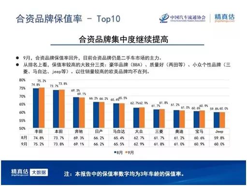9月合资品牌保值率整体呈现上升趋势,目前合资品牌仍是二手车市场的主力。从排名上看,保值率较高的大致分三类:豪华品牌(BBA)、耐用品牌(丰田、本田等)以及小众个性品牌(三菱、马自达、jeep)。我们看到了丰田/本田交替在第一、二位已经非常久,“品牌力、产品力”持续坚挺。