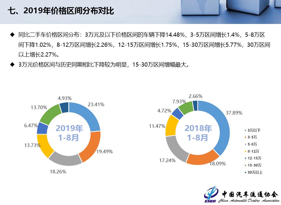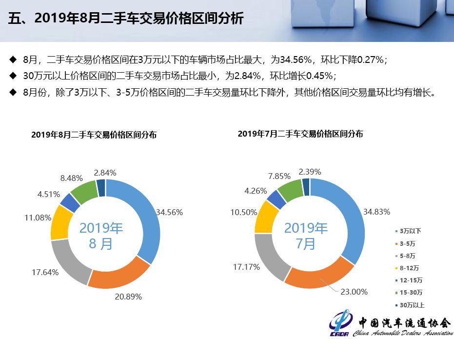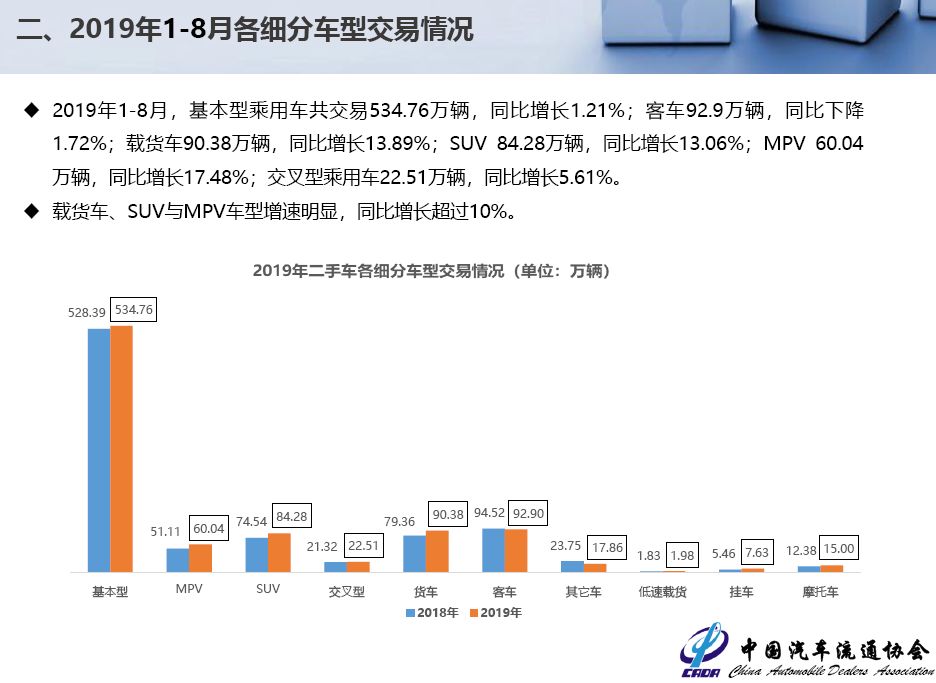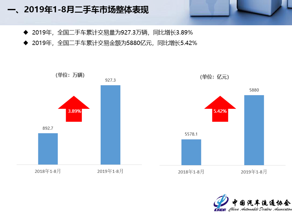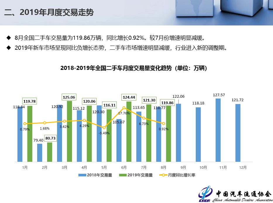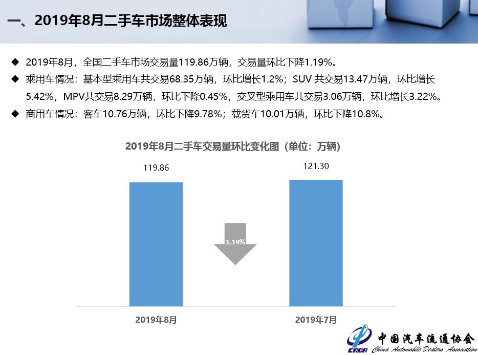 中国汽车流通协会:2019年8月全国二手车市场分析 导读:2019年8月全国二手车市场交易量119.86万辆,交易量环比下降1.19%,同比增长0.92%,较7月份增速明显减弱。2019年新车市场呈现同比负增长态势,二手车市场增速明显减缓,行业整体进入新的调整期。具体分析如下: 更多阅读:中国汽车流通协会:2018年6月全国二手车市场分析中国汽车流通协会: 2018年全国二手车市场分析中国汽车流通协会:2018年8月二手车市场分析中国汽车流通协会:2019年2月份全国乘用车市场分析中国汽车流通协会:2018年9月份全国乘用车市场分析中国汽车流通协会: 2019年7月二手车市场分析中国汽车流通协会:2019年8月二手车市场分析中国汽车流通协会:2019年1月二手车市场分析中国汽车流通协会:2020年1-2月二手车市场分析中国汽车流通协会:2020年11月份全国乘用车市场分析中国汽车流通协会:2019年11月份全国乘用车市场分析中国汽车流通协会:2020年2月份全国乘用车市场分析中国汽车流通协会:2020年3月份全国乘用车市场分析中国汽车流通协会: 2020年5月份全国乘用车市场分析中国汽车流通协会:2019年6月份全国乘用车市场分析