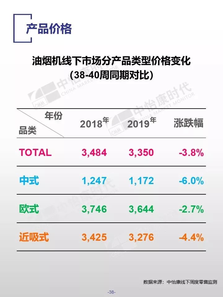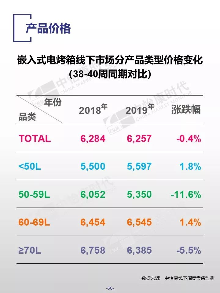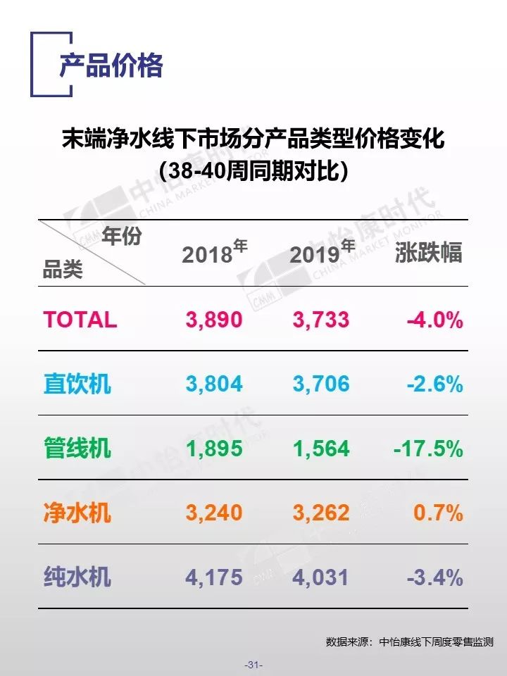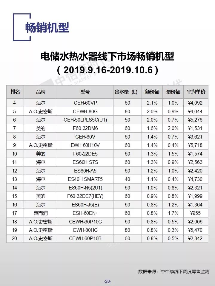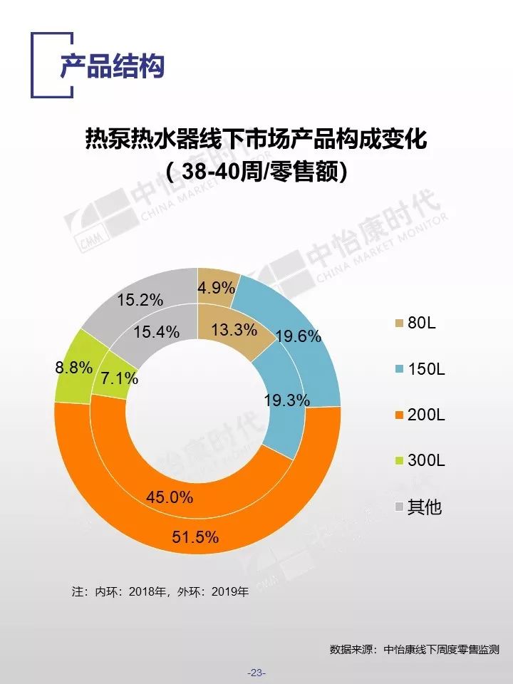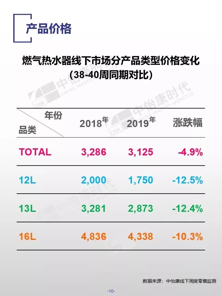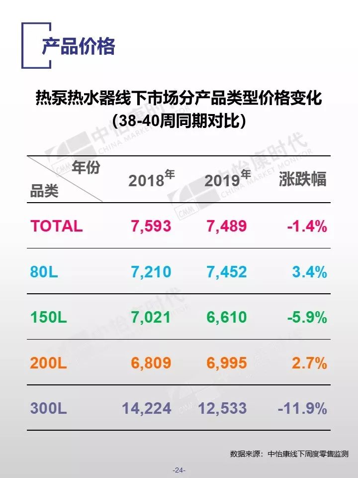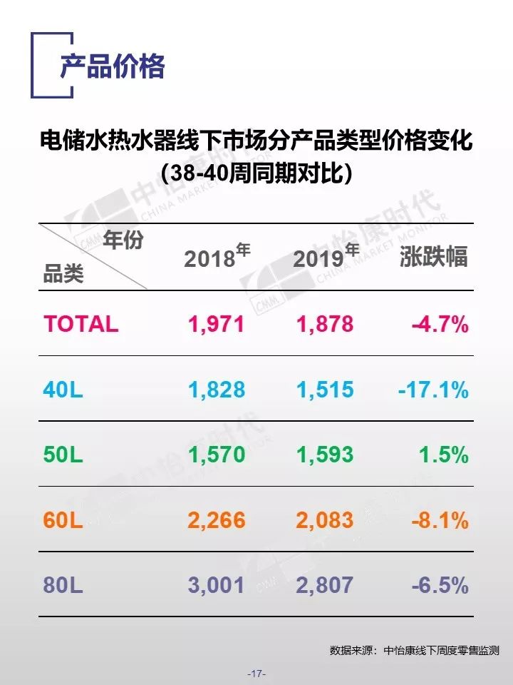 在销售规模方面,中怡康监测范围内,38-40周,燃气热水器/电储水热水器/热泵热水器/末端净水/吸油烟机/燃气灶3周零售量,分别为12.9万台,15.4万台,0.3万台,6万台,15万台和15万台。在销售均价方面,一些品类的产品均价仍保持增长,如50L电储水式热水器、80L热泵热水器、净水机等。
