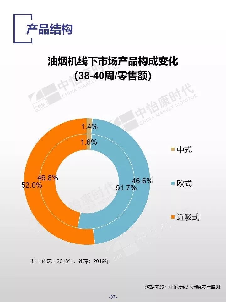 时间维度38周到40周,厨卫线下整体市场表现低迷,主要品类市场零售额和零售量均呈现同比下滑,且幅度达到两位数。分周度来看,38周、39周和40周市场表现各不相同,可以分别用三个词概括:38周——断崖下滑,39周逆势增长,40周下滑收窄。具体来看,38周,厨电市场主要品类量额同比下滑幅度接近50%,39周十一促销提升作用明显,主要品类量额同比出现增长,转至40周,市场量额同比继续下滑,但幅度比十一黄金周前有所收窄。