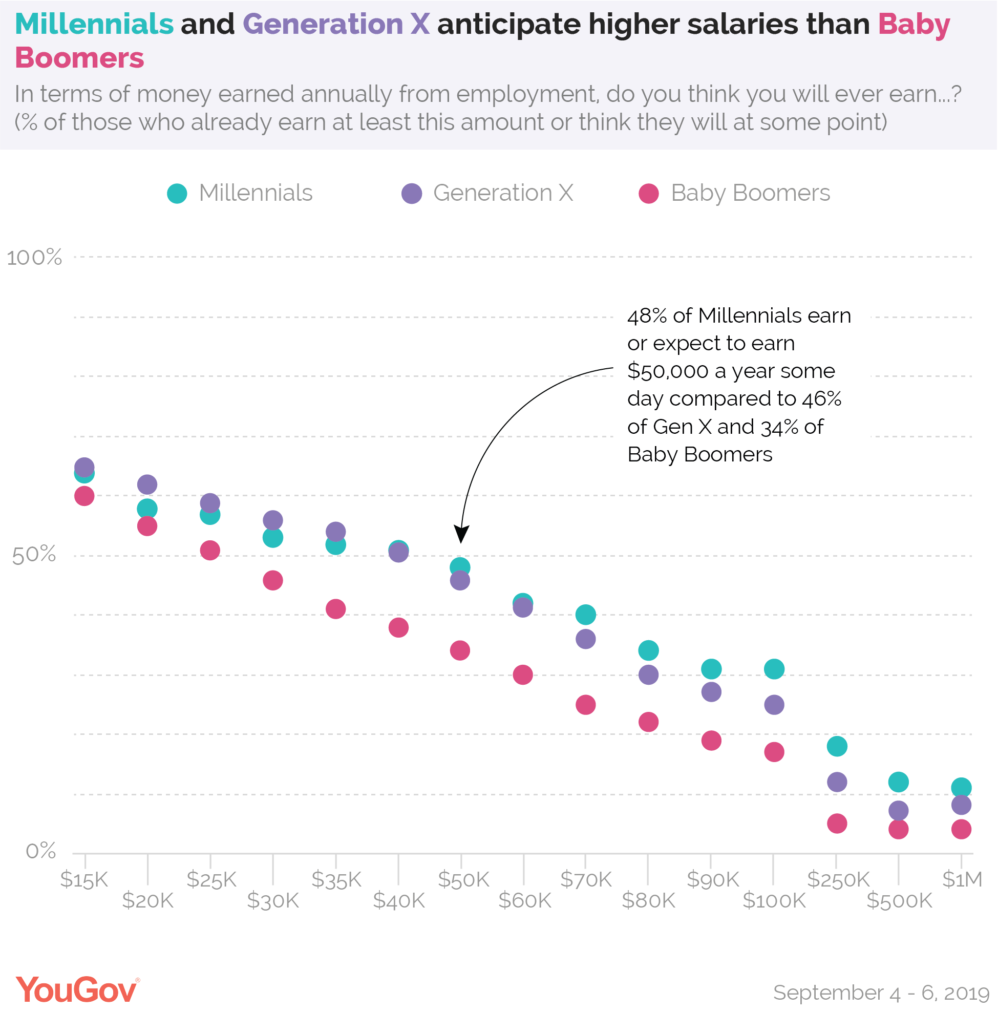 千禧一代(9%)比X一代(6%)和婴儿潮一代(3%)更可能期望每年赚一百万美元。雄心勃勃的目标在很大程度上反映在了年轻人身上,因为年轻一代更有可能期望在自己的一生中获得更多的收入。